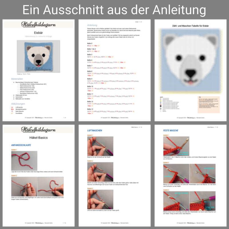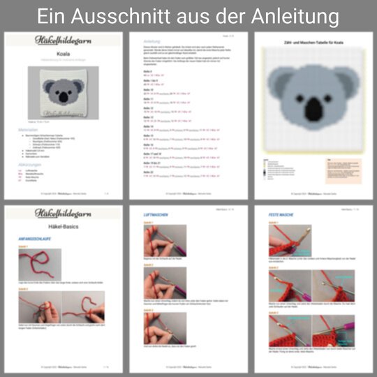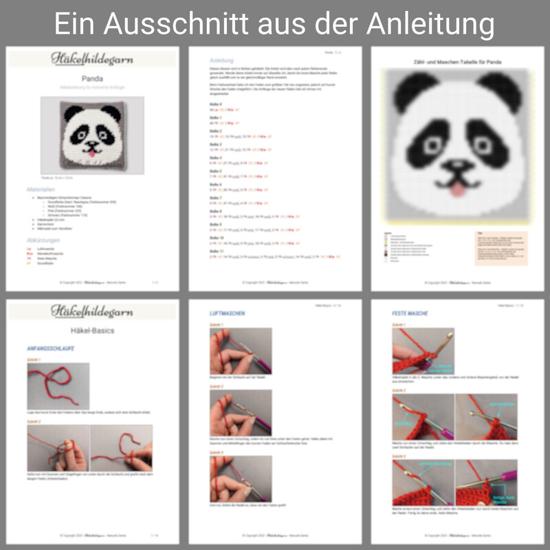 In der Anleitung wird keine Häkelschrift verwendet. Die Maschentabelle ist so gestaltet, dass das Häkeln durch fertig gezählte Maschen erleichtert und beschleunigt wird. Es wird in Reihen und festen Maschen gehäkelt.