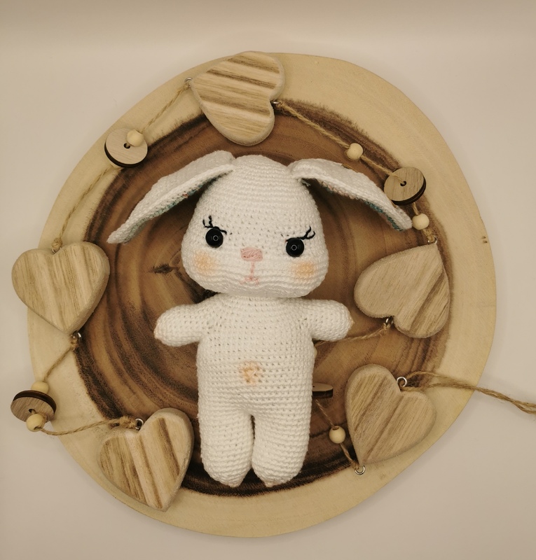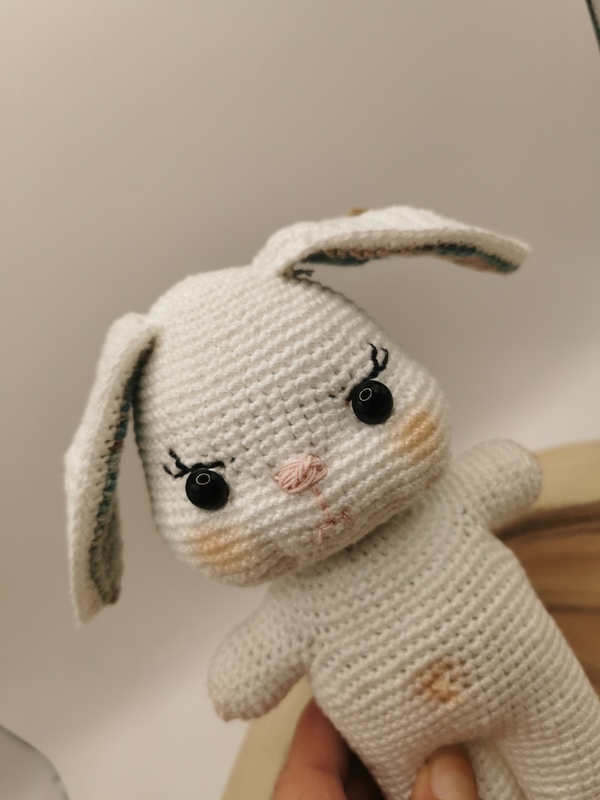 Das Häschen wird aus Baumwollgarn gehäkelt und erhält durch die Sicherheitsaugen einen süßen, niedlichen Look. Achtung: Bis auf den Schwanz gibt es keine annähbaren Teile, was die Arbeit besonders unkompliziert macht.