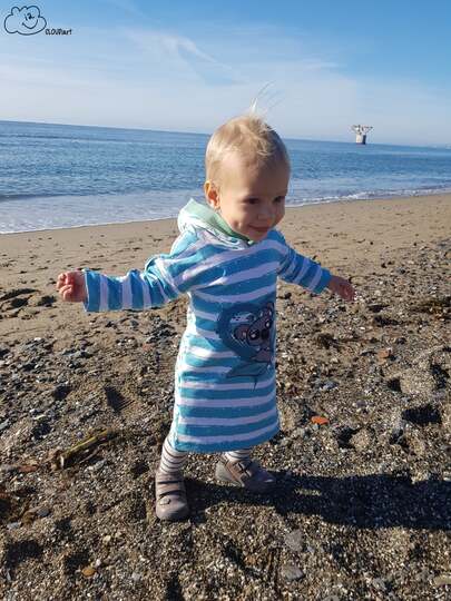 Den Schnitt habe ich in Gr. 74 bis 152 in meinem Echtgrößensystem für dich gradiert. Dabei passt z.B. Größe 74 ab einer Körpergröße von 74cm bis 79cm usw. Das Schnittmuster enthält weder Naht- noch Saumzugabe und ist auf dehnbare Stoffe wie Jersey oder weichen French Terry ausgelegt.
