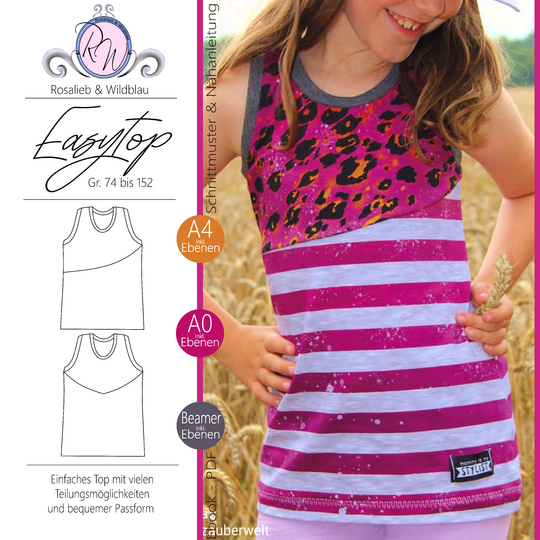Das Schnittmuster ist in Echtgröße (du nähst hier nach echter Körpergröße) gradiert und enthält keine Naht- und Saumzugabe. Es umfasst die Größen 74 bis 152 und ist damit für eine Körpergröße zwischen 74 und 157cm geeignet. In den Dateien findest du die A4-Versionen zum Ausdrucken, eine Großdruckdatei sowie die Beamerdatei - alle Versionen inkl. Ebenen zum Ein- und Ausblenden der Größen. EasyTop ist auf Jersey und Bündchenware ausgelegt