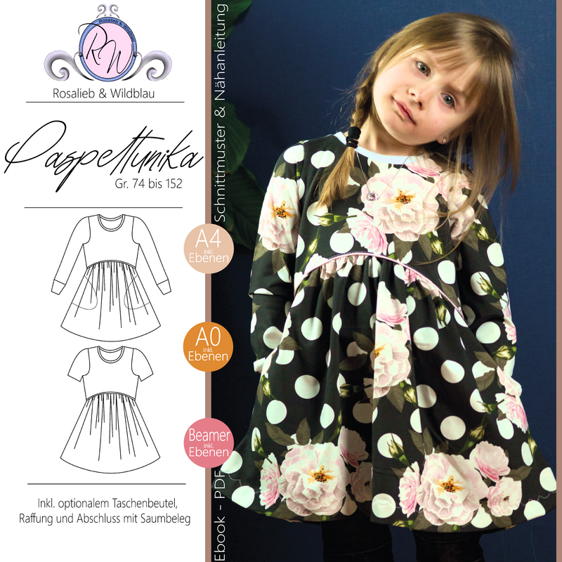 luftig leichte Tunika mit dem gewissen Etwas. Die Paspeltunika ist ein Schnitt aus meiner Basicserie. Alle Schnitte, die dazugehören, sind dazu gedacht, ein einfaches, unkompliziertes Nähen zu ermöglichen und Stoffe toll wirken zu lassen. Besonderes Augenmerk habe ich darauf gelegt, dass die Schnittmuster, trotz ihrer eher einfachen Form, das gewisse Etwas nicht verlieren. Eben Teilchen, die Spaß machen, sich ultra bequem tragen lassen, für Anfänger geeignet sind und einfach trotzdem viel hermachen :)! Die Paspeltunika ist das Schnittmuster zu einer Tunika mit Teilung auf Unterbrusthöhe. Diese Teilung lässt sich besonders schön mit einer Paspel umsetzen. Die Umsetzung mit einer Paspel verleiht dem Schnittmuster den Namen. Ist die Passform oben eher körpernah gedacht, springt die Tunika direkt nach der Teilung durch die Raffung des Stoffes auf und bekommt eine super lockere, wallende Form. Der rundliche Abschluss der Tunika wird mit einem Saumbeleg verarbeitet - eine absolut wundervolle Abschlussart, die ein sauberes Arbeiten einfach und schnell möglich macht. Die Ärmel der Tunika sind auf das Anbringen eines Bündchens ausgelegt, lassen sich nach einer Verlängerung (in der Anleitung beschrieben), aber auch säumen. Die Tunika bietet mit optionalen Taschenbeuteln eine weitere Gestaltungsmöglichkeit. Sieh dir am besten gleich die tollen Designbeispiele weiter hinten im Ebook an, um viele tolle Inspirationen zu entdecken!