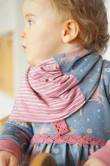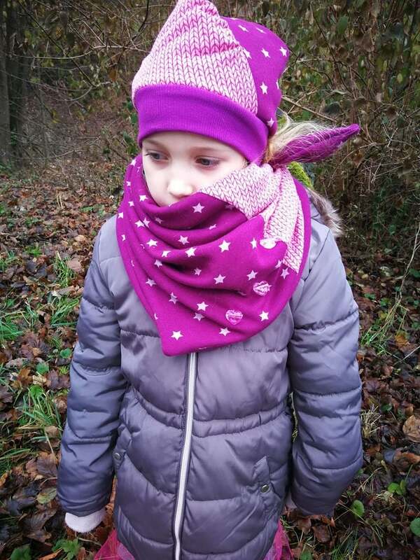 Das Set besteht aus zwei Schnitten meiner Basicserie. Alle Schnitte, die dazugehören, sind dazu gedacht, ein einfaches, unkompliziertes Nähen zu ermöglichen und Stoffe toll wirken zu lassen. Besonderes Augenmerk habe ich darauf gelegt, dass die Schnittmuster trotz ihrer eher einfachen Form, das gewisse Etwas nicht verlieren. Eben Teilchen, die Spaß machen, sich ultra bequem tragen lassen, für Anfänger geeignet sind und einfach trotzdem viel hermachen :)! Die Mütze und das Halstuch sind simpel haben aber doch das gewisse Etwas! Beide Schnitte werden entweder mit Falten oder Raffung umgesetzt und weisen dafür spezielle Teilungen auf. Die Mütze ent- spricht am ehesten einer Beanie-Mütze und wird vorne mit einem Bündchen abgeschlossen. Hinten endet sie eher eckig, was in einem coolen Kontrast zur Raffung oder den Falten steht. Das Halstuch kann besonders bei einem Mix aus verschiedenen Stoffen punkten, wird gerne mit Knöpfen oder Rüschen verziert und ist je nach Stoffwahl ein treuer Begleiter für jede Jahreszeit. Das Halstuch wird mit Druckknöpfen verschlossen. Das sorgt dafür, dass kein dicker Knoten am Hals benötigt wird, der das Halstuch schließen würde. Enthalten sind hier 3 Größen, sodass sogar wir Mamas etwas von dem Halstuch haben.