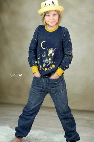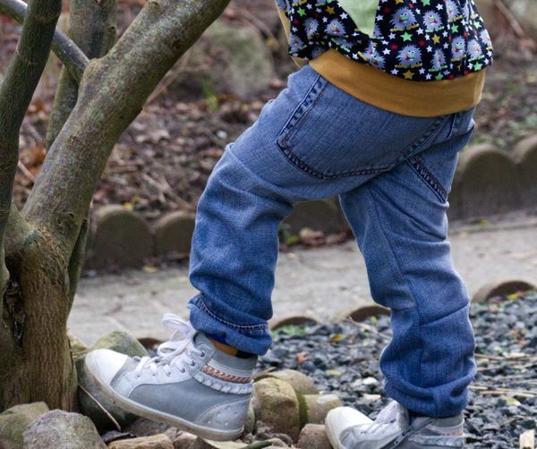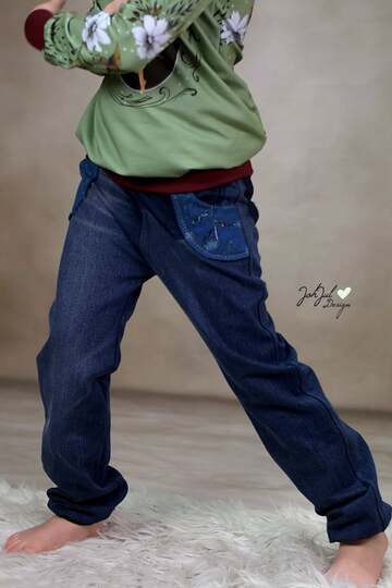 treuer Begleiter und doch besonders. Die Pumpjeans ist ein Schnitt aus meiner Basicserie. Alle Schnitte, die dazu gehören, sind dazu gedacht, ein einfaches, unkompliziertes Nähen zu ermöglichen und Stoffe toll wirken zu lassen. Besonderes Augenmerk habe ich darauf gelegt, dass die Schnittmuster, trotz ihrer eher einfachen Form, das gewisse Etwas nicht verlieren. Eben Teilchen, die Spaß machen, sich ultra bequem tragen lassen, für Anfänger geeignet sind und einfach trotzdem viel hermachen :)! Die Pumpjeans ist ein treuer Begleiter für Kindergarten, Schule und Spielplatz. Sie lässt sich prima aus nicht dehnbaren Stoffen nähen und wird natürlich am liebsten aus Jeansstoff gefertigt. Neben dem pumpigen Beinabschluss bietet die Hose eine tolle Taschenoption. Die Taschen befinden sich auf der Front und können entweder einfach umgesetzt werden oder mit Falten bzw. Raffung. So bekommt jede Jeans ein kleines High- light, dass sie nicht zu aufdringlich wirken lässt und trotzdem besonders macht. Die Abschlüsse sind bei dieser Hose auf das Anbringen von Bündchen ausgelegt.