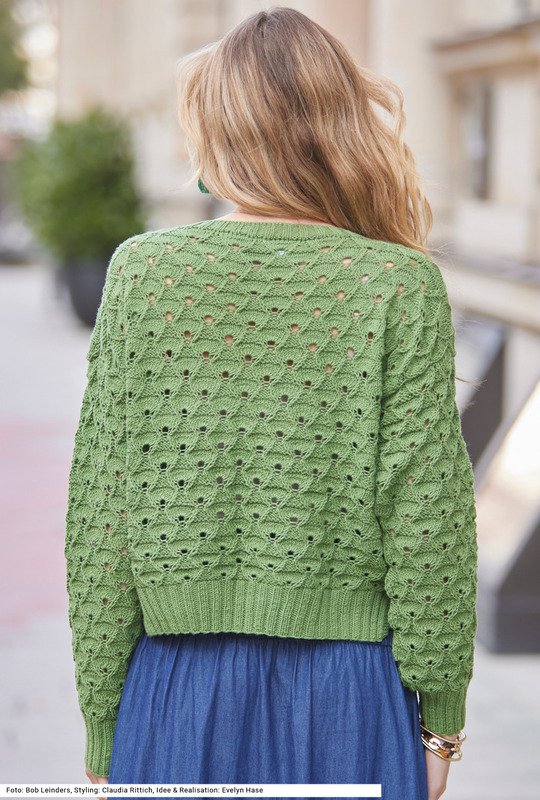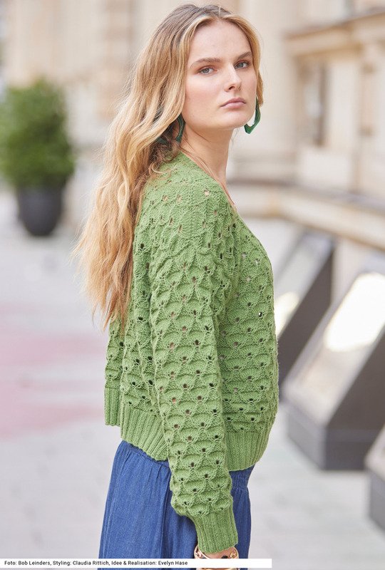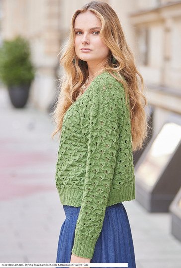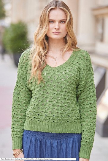 Bei diesem Pulli ist nicht nur das Muster ein Hingucker, es sind auch die kleinen Details wie eine rechte Masche, die am V-Ausschnitt entlang läuft, und die kleinen Seitenschlitze am Bund und nicht zuletzt die über die Schulter hinweg nach hinten versetzten Schulternähte. Für das Ajourmuster gibt es mehrere Strickschriften, damit die Abnahmen am V-Ausschnitt gut gelingen. Der Pullover wird aus einem pflegeleichten Merino-Mischgarn gestrickt, das in der Waschmaschine gewaschen werden kann. Eine Anleitung gibt es für die Größen 38/40, 44 und 48/50.