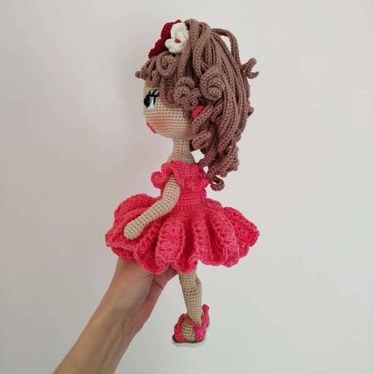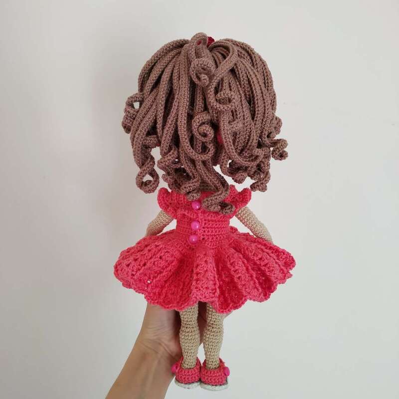 Diese Häkelanleitung enthält eine detaillierte Beschreibung mit vielen Schritt-für-Schritt-Fotos, wie man einen Puppenkörper, eine Frisur, das Gesicht, das Kleid, die Schuhe, das Band und das Höschen anfertigt.