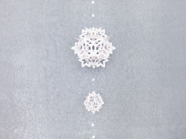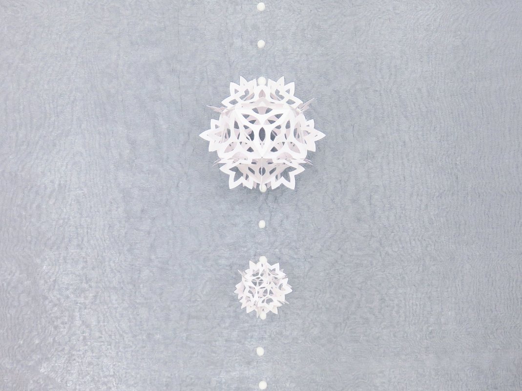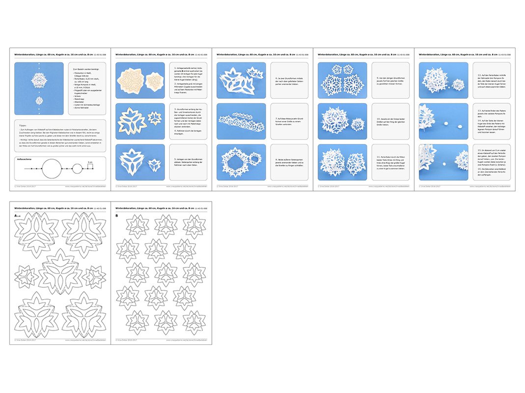 Beide Kugeln sind nach einer gut bekannten Technik erstellt, bei der die Dreiecke in der Mitte der einzelnen Grundformen die eigentliche Kugelform bilden und die abstehenden Teile aneinandergeklebt werden. In diesem Fall sind die Einzelteile nur filigraner gestaltet - das sieht hübscher aus, ist aber auch etwas aufwendiger zu basteln. Wenn du aber gut mit Cutter und Schere umgehen kannst, wirst du mit dieser Deko ohne Mühe fertig.