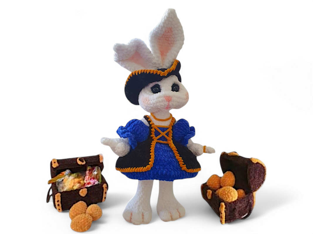 Nora bringt nicht nur Kinderaugen zum Leuchten. Sie ist auch im Eingangsbereich ein echter Hingucker und lässt jedes Haus im osterlichen Piratenglanz erstrahlen. Diese Anleitung beinhaltet „nur“ Anweisungen mit denen Nora und die Schatzkisten gehäkelt werden können. Captain Klappohr ist unter diesem Link separat erhältlich.