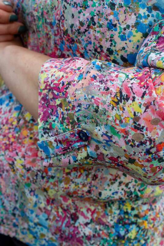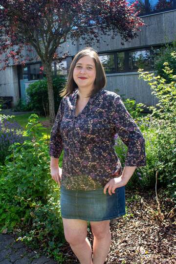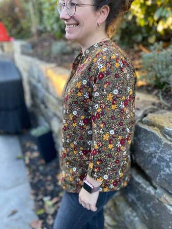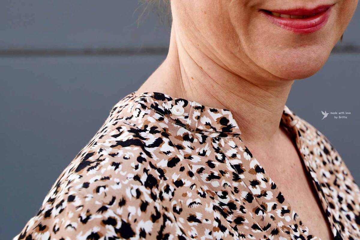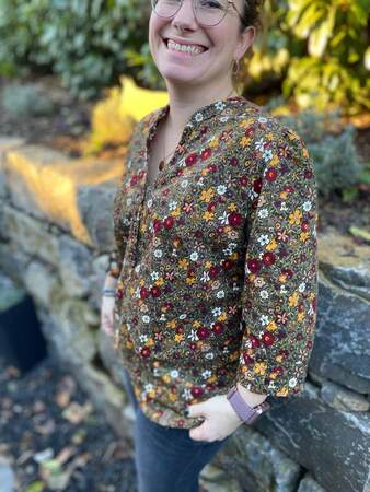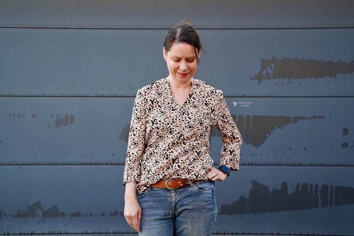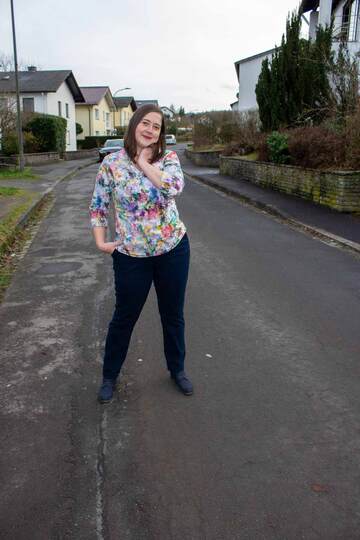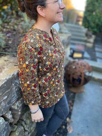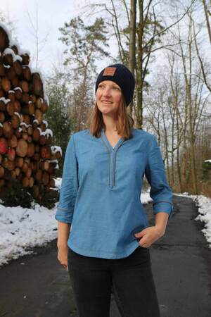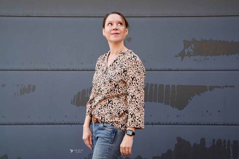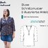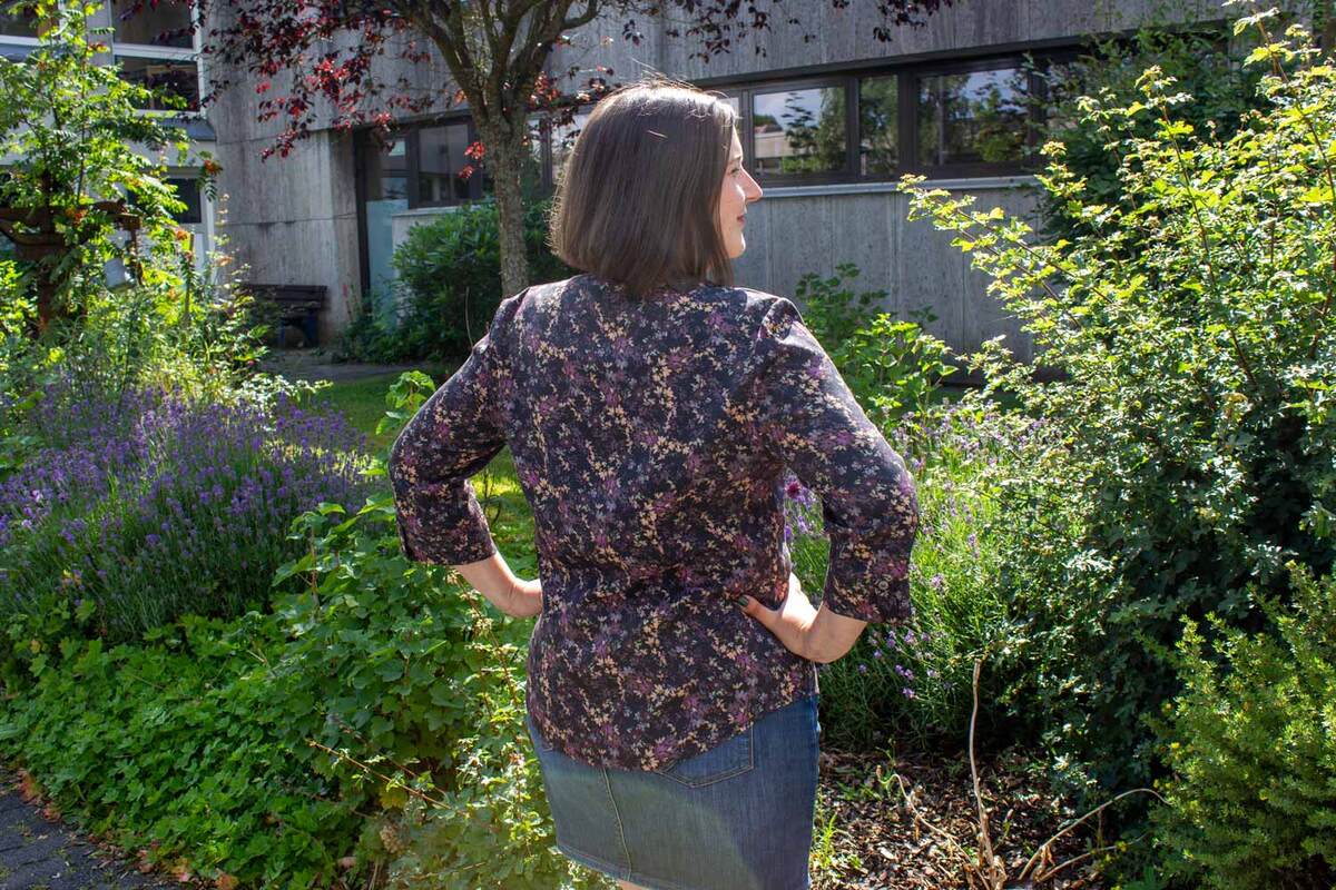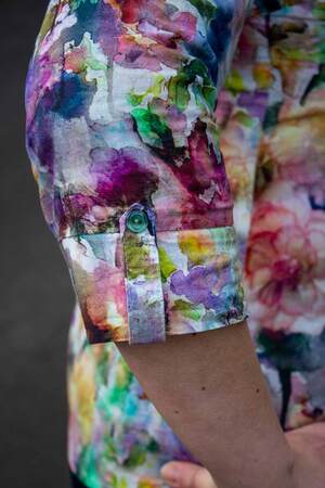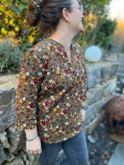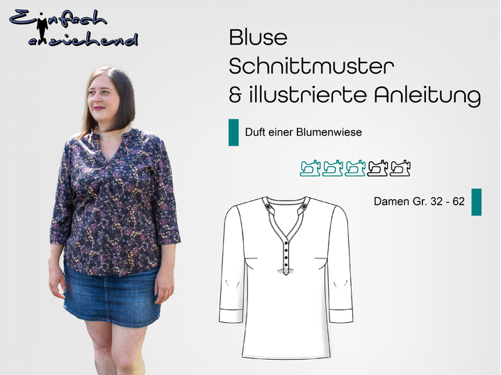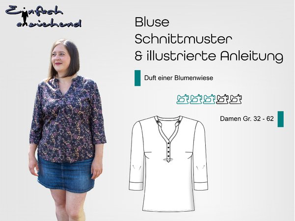 Dieser Schnitt für eine Bluse aus Viskose, Baumwoll, etc. Webware mit 3/4-Ärmeln mit Manschetten und optionalem Saumriegel, eine halben geschwungenen Knopfleiste die in einen schmalen Liegekragen übergeht, der sowohl normal als auch mit Umschlag in Richtung Schulter genäht werden kann und einem geraden und einem abgerundetem Saum, sowie optionalen Taillenabnähern, trägt den schönen Namen "Duft einer Blumenwiese".