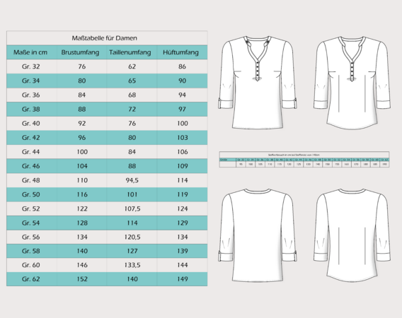Im Schnittmuster enthalten sind die Damengrößen 32 - 62.