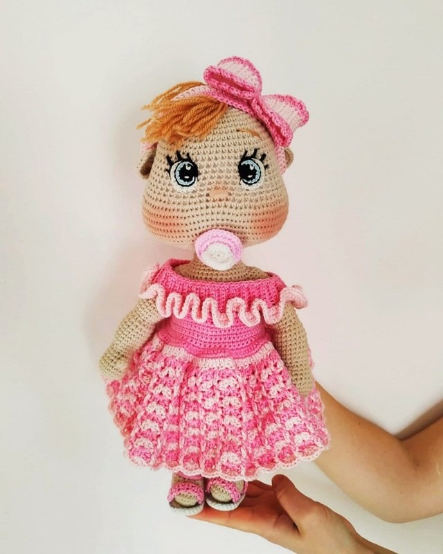 Diese Häkelanleitung enthält eine detaillierte Beschreibung mit vielen Schritt-für-Schritt-Fotos, wie man einen Babypuppenkörper mit gehäkelten Augen, Schnuller, Kleid, Sandalen, Stirnband und Höschen bastelt.