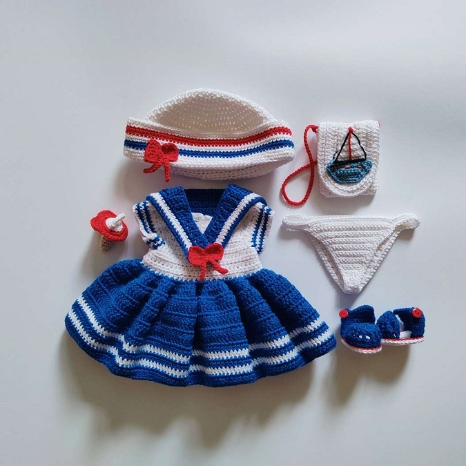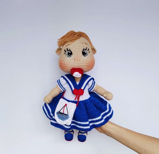 Diese Häkelanleitung enthält eine ausführliche Beschreibung mit vielen Schritt-für-Schritt-Fotos, wie man die Babypuppe Lulu im Marine-Outfit bastelt.