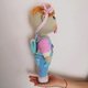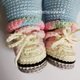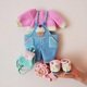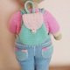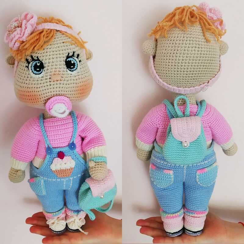 Diese Häkelanleitung enthält eine ausführliche Beschreibung mit vielen Schritt-für-Schritt-Fotos, wie man eine Babypuppe in T-Shirt, Jeans und Turnschuhen, mit Stirnband und Rucksack bastelt.