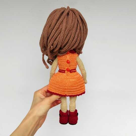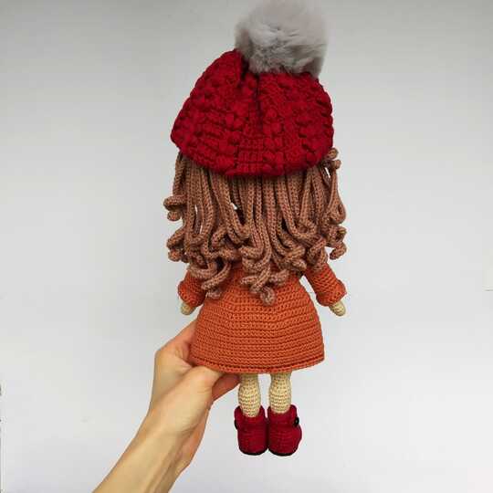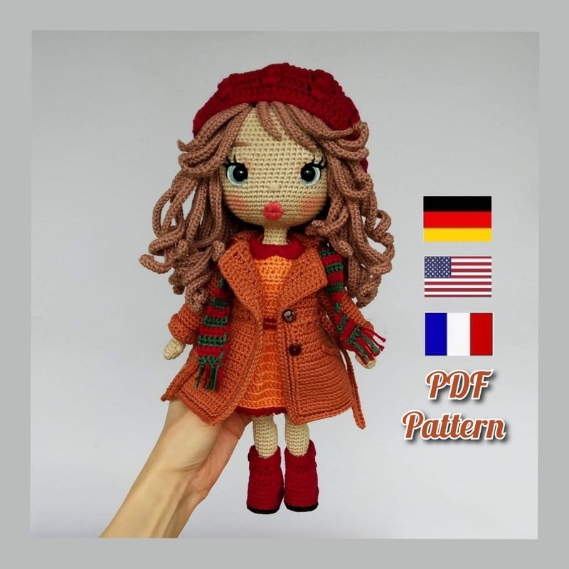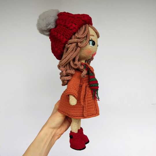 Diese Häkelanleitung enthält eine detaillierte Beschreibung mit vielen Schritt-für-Schritt-Fotos, wie man einen Puppenkörper, eine Frisur, das Gesicht, ein Kleid, einen Mantel, eine Mütze, einen Schal, Stiefel und ein Höschen anfertigt.