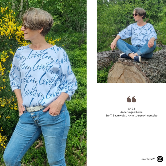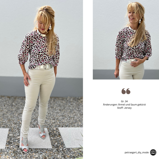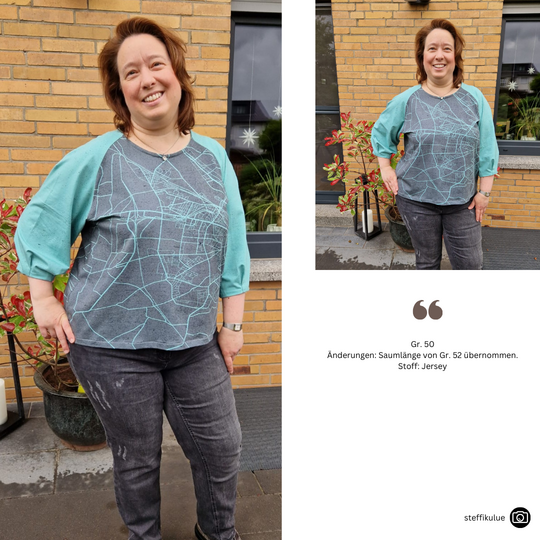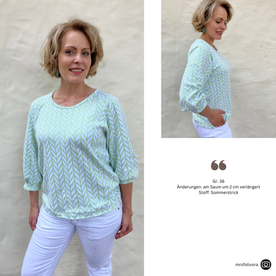 Das leichte Shirt mit Rundhalsausschnitt und Dreiviertel-Puffärmeln ist ein Muss für alle Näh-Abenteurer! Die Falten an den Ärmeln sorgen für die perfekte Herausforderung beim Nähen. Mit den einfach einzunähenden Raglanärmeln entsteht eine wunderschöne Linienführung. Der lockere, gerade Schnitt ermöglicht es, das Shirt auf vielfältige Weise zu stylen. Egal ob schlicht zur Jeans oder schick mit einem Rock, das Shirt sorgt immer für einen aufregenden Look. Der Stoff und das Muster spielen dabei eine große Rolle und lassen das Shirt noch besser zur Geltung kommen. Für Mutige bietet der Schnitt auch die Möglichkeit, die Ärmel farblich abzusetzen.Dieses Muster ist für den persönlichen Gebrauch bestimmt.