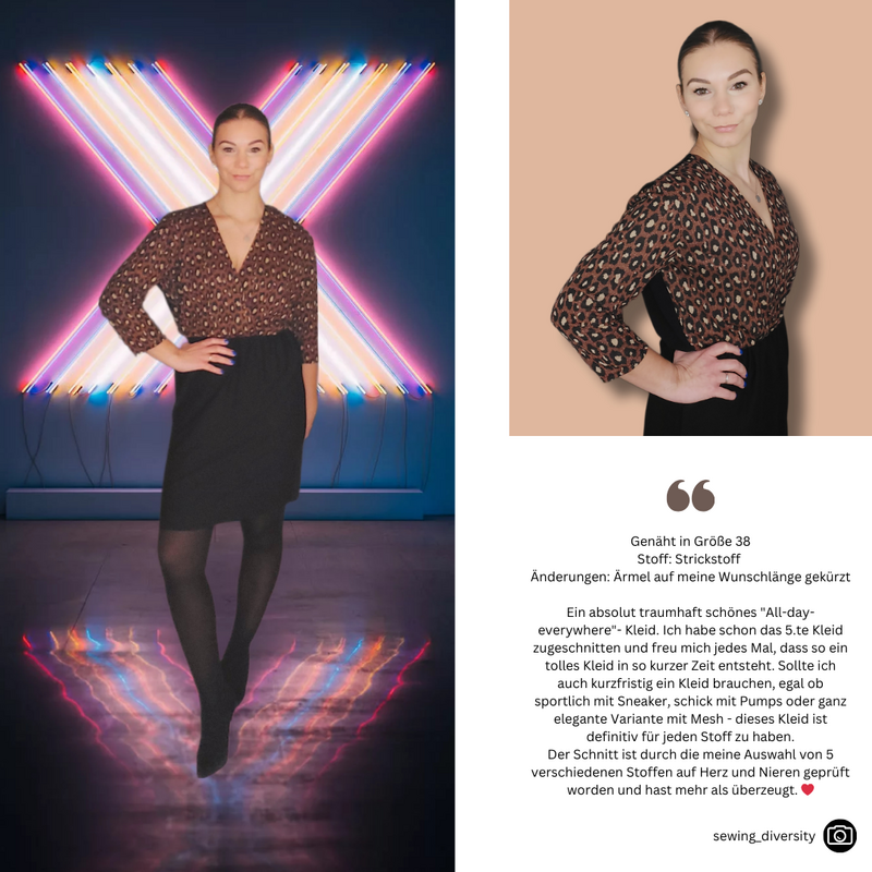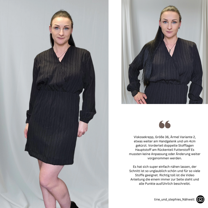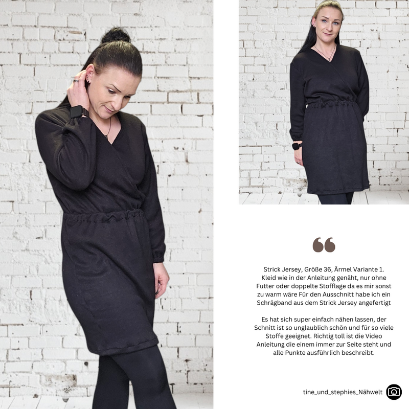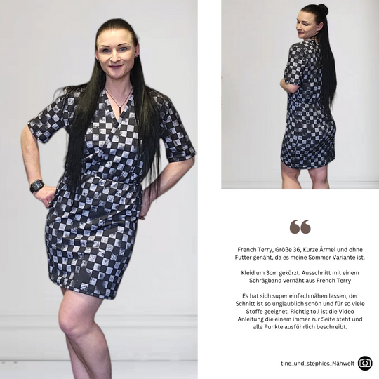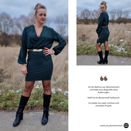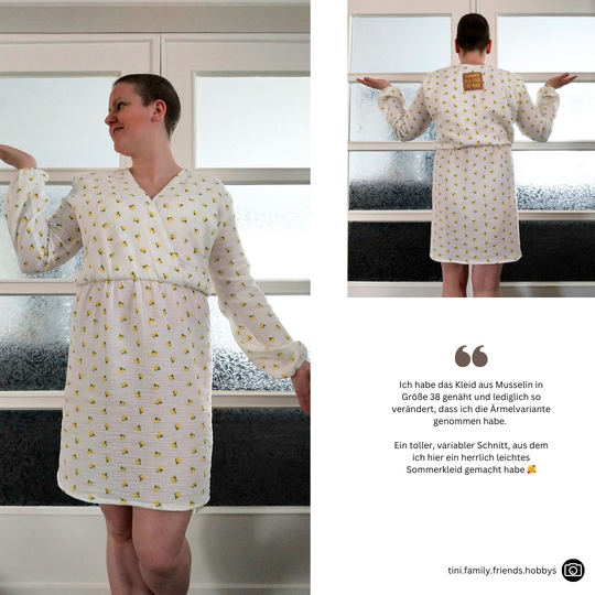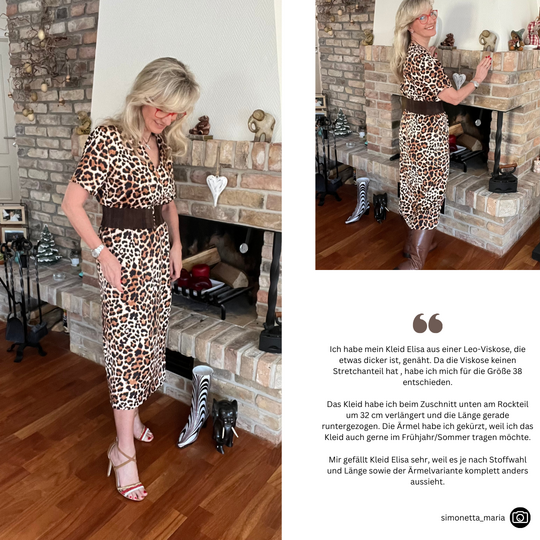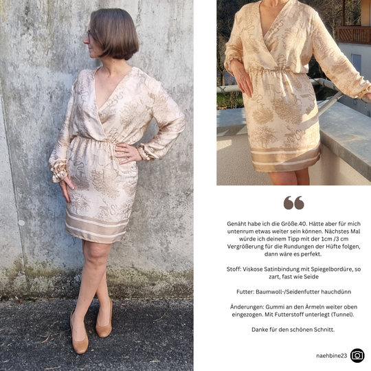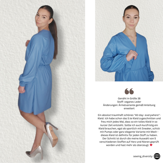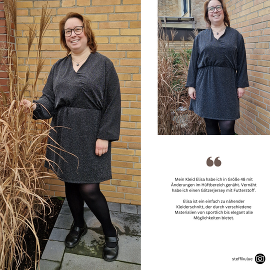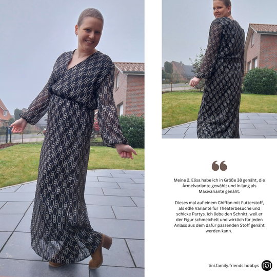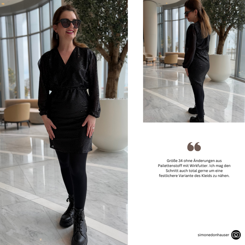 ELISA ist ein elegantes und vielseitiges Kleid mit langen Ärmeln und einem femininen, etwas tieferen Ausschnitt. Die raffinierte Wickeloptik im Vorderteil betont fließende Stoffe besonders schön. In der Taille sorgt ein verstecktes Gummiband für eine schmeichelhafte Passform, während das gerade geschnittene Rockteil luftig und locker fällt.Das Kleid lässt sich wunderbar aus verschiedenen Stoffen nähen – von zarten, transparenten Materialien wie Chiffon bis hin zu glamourösen Stoffen wie Satin oder Pailletten. Durch die Wickeloptik und die Möglichkeit, ein Futter einfach einzunähen, kannst du ELISA individuell anpassen, sei es für den Alltag, festliche Anlässe oder als stilvolles Layering-Kleid über einem Pullover.Dieses Muster ist für den persönlichen Gebrauch bestimmt.