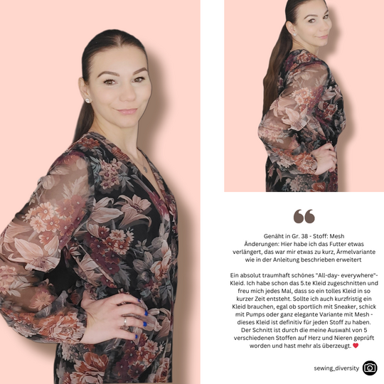 Das Schnittmuster ELISA ist speziell für fließende Webwarestoffe entworfen. Diese Materialien betonen die harmonischen Linien des Kleides und lassen den Schnitt besonders gut zur Geltung kommen. Wähle Stoffe wie Chiffon, Satin oder Viskose, um einen leicht fallenden Look zu kreieren. Für einen auffälligeren Stil eignen sich auch Stoffe wie Samt oder Paillettenstoffe – wichtig ist, dass der StoffStoffempfehlungen mit Links in der Nähanleitung enthalten!