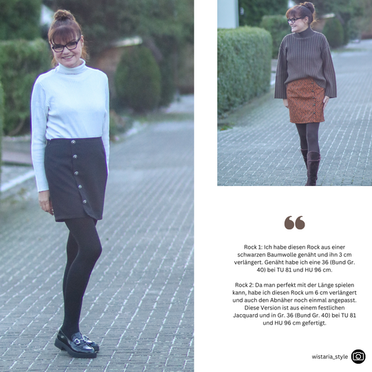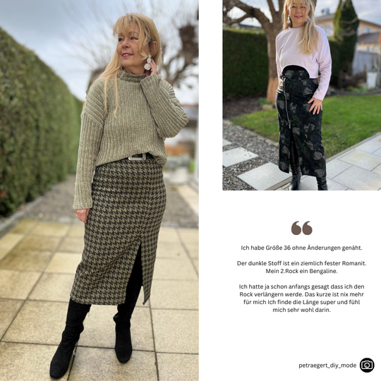 Das Schnittmuster LILLY ist für Webware ausgelegt. Am Besten eignen sich Hosen und Anzugstoffe, Bouclé, Tweed, Baumwollsatin, Cord, Denim oder andere Webwarestoffe für Röcke. Der Stoff kann auch einen kleinen Elasthan-Anteil haben.Stoffempfehlungen mit Link in der Nähanleitung enthalten!