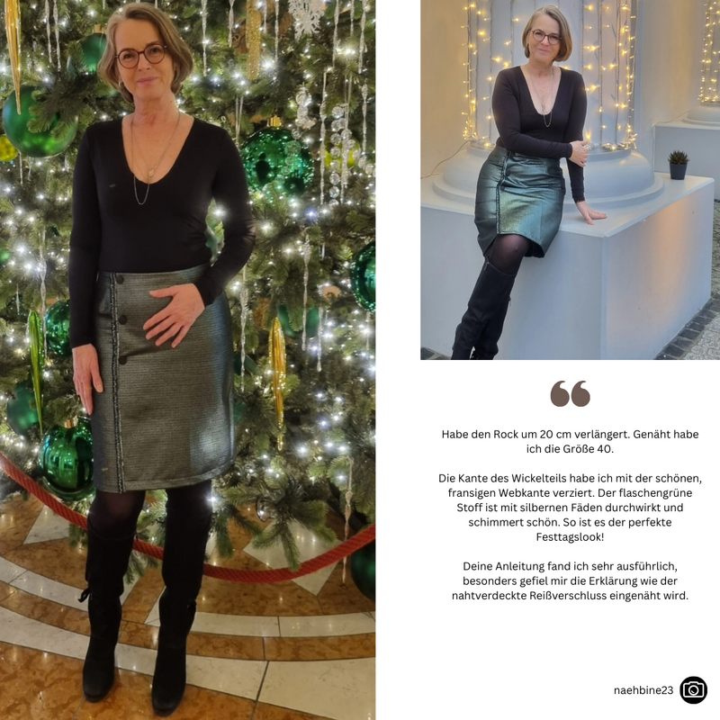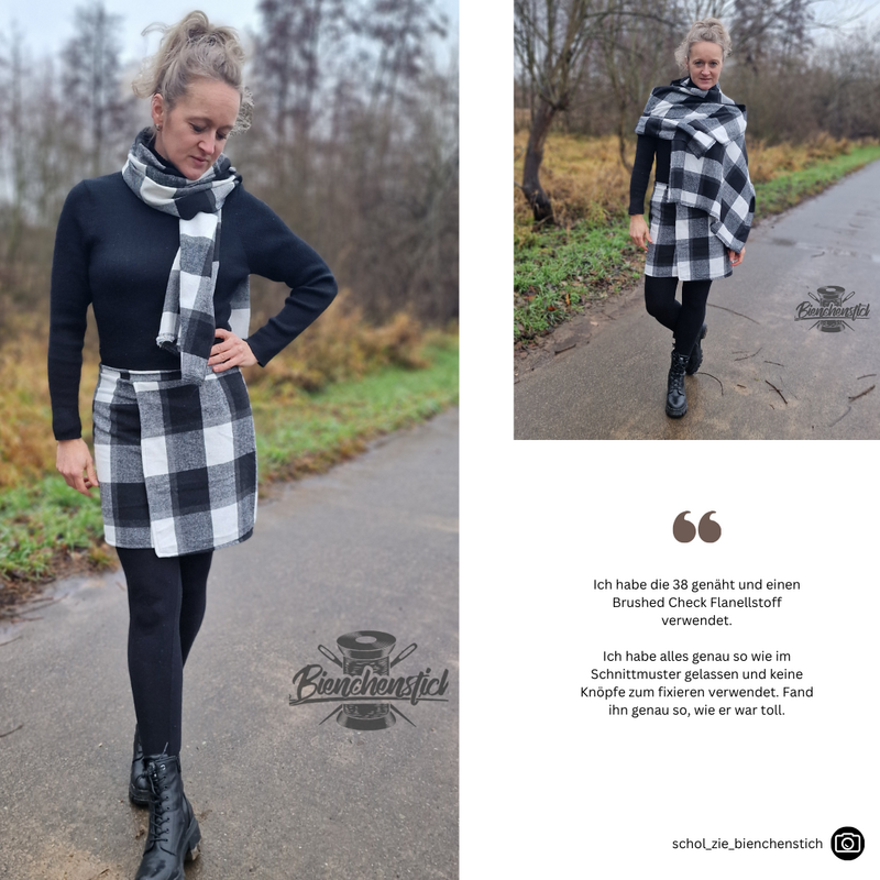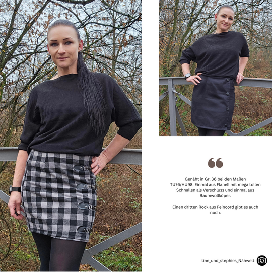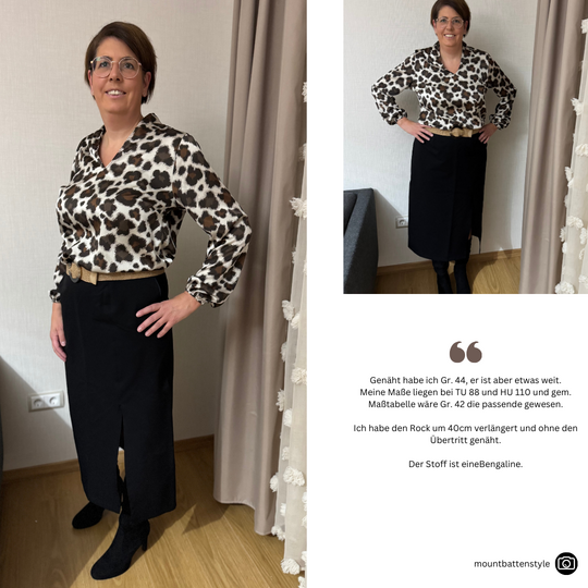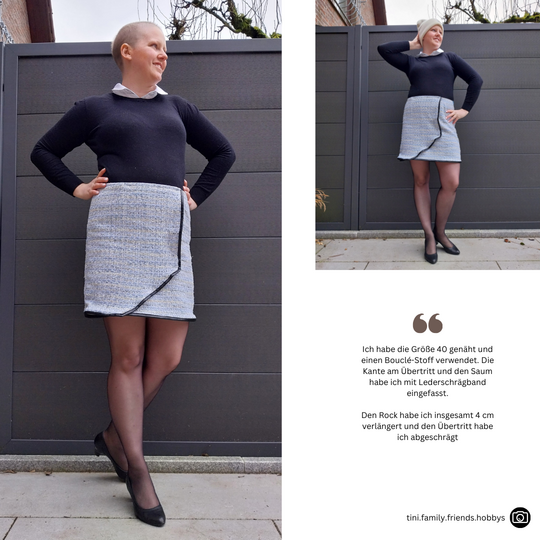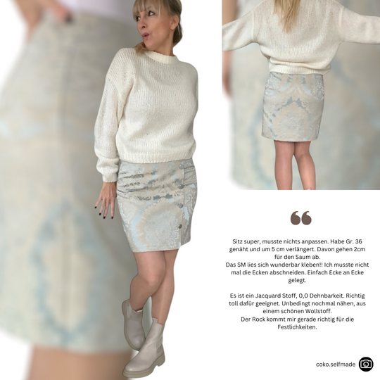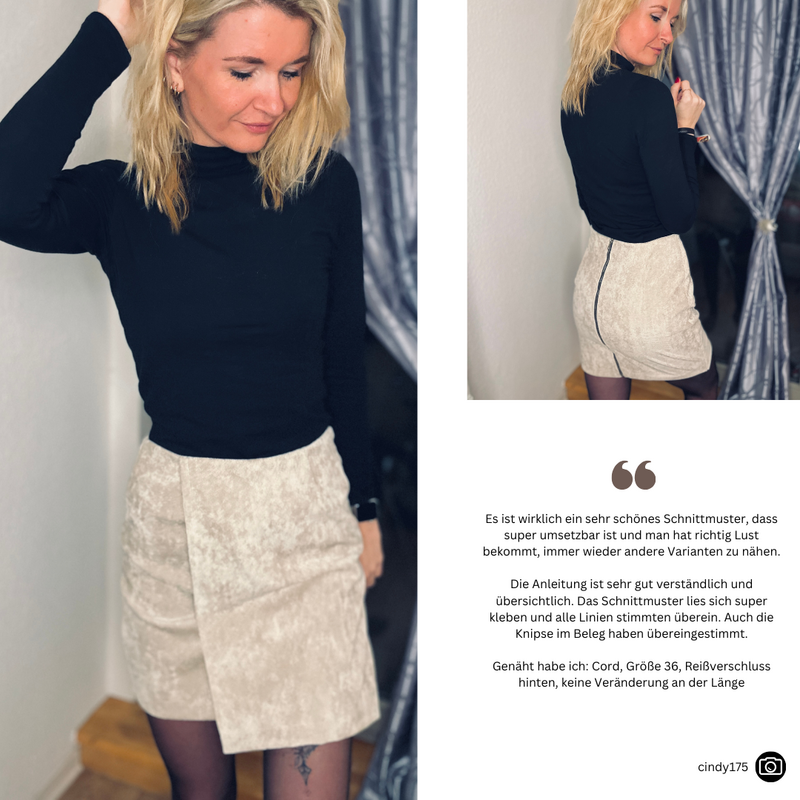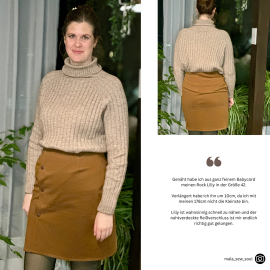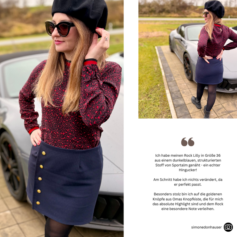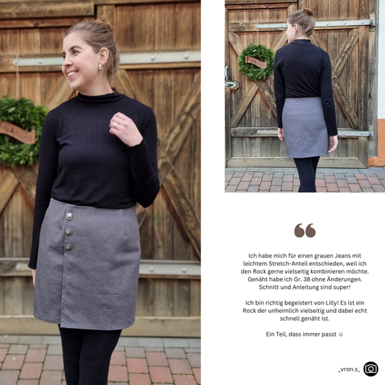 Das Schnittmuster LILLY präsentiert einen figurnahen Minirock mit raffinierter Wickeloptik. Der Rock endet oberhalb des Knies und betont durch seine schmale Passform die Silhouette. Das Besondere ist der Übertritt im Vorderteil, der den Anschein eines Wickelrocks erweckt. Der Übertritt auf der Vorderseite ist das besondere Highlight dieses Modells: Durch die dekorativen Knöpfe, die vertikal angebracht sind, wird die Illusion eines Wickelrocks erzeugt. Anders als bei echten Wickelröcken sorgt LILLY jedoch dafür, dass beim Sitzen oder Gehen nichts verrutscht.Dieses Muster ist für den persönlichen Gebrauch bestimmt.