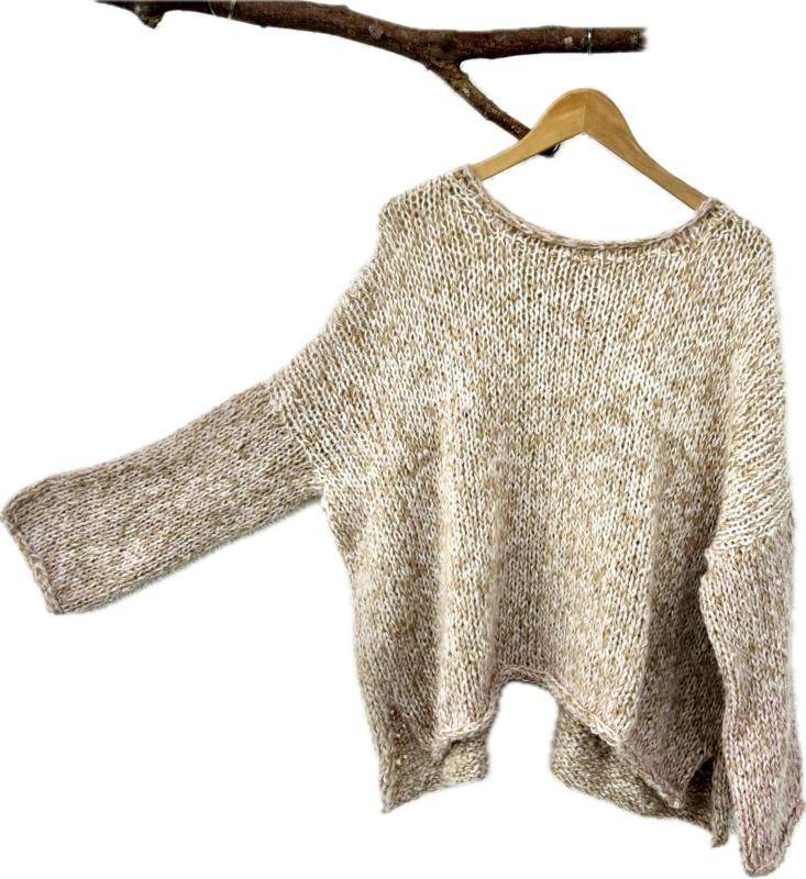 Dieser Pullover ist groß, kuschelig und ohne viel Schnickschnack einfach und schnell zu stricken. Du kannst verschiedene Garne oder Reste – unbedingt auch flauschig – gleichzeitig verstricken. Schnapp Dir eine richtig dicke Stricknadel und probiere es aus. Ich kann Dir versprechen: Kein Pullover wird dem anderen gleichen! Und als Bonus: Das Stricken geht superschnell von der Nadel.