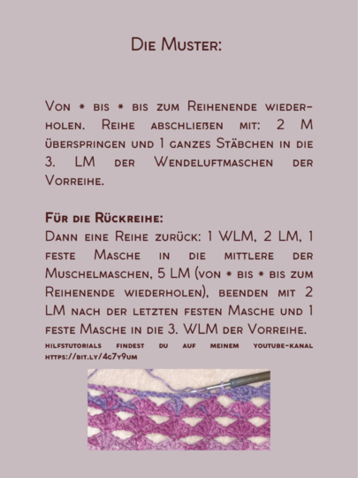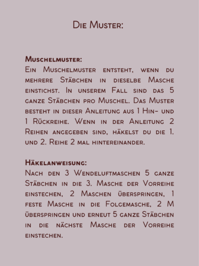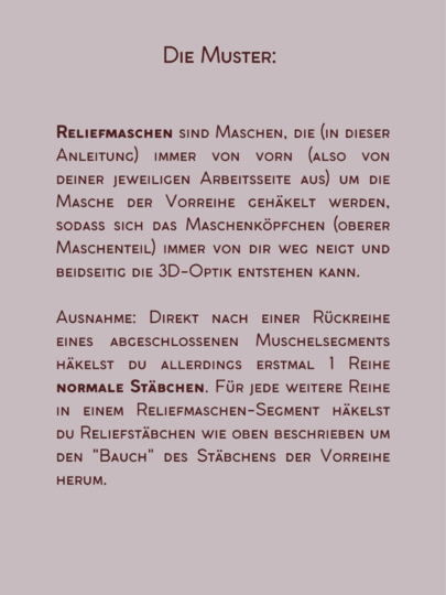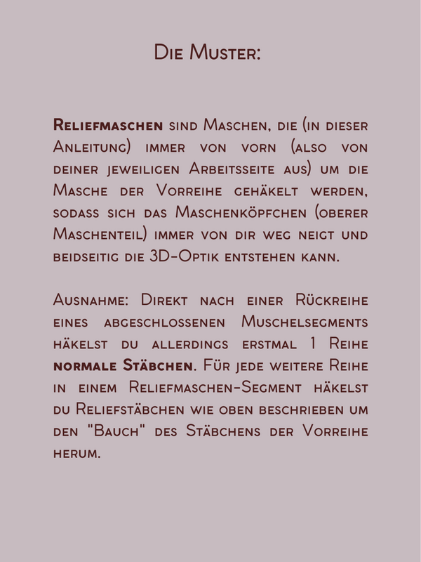 Die Anleitung führt dich Schritt für Schritt durch das Muschelmuster und die Reliefstäbchen – von der ersten bis zur letzten Reihe. Ich erkläre dir genau, was zu tun ist.