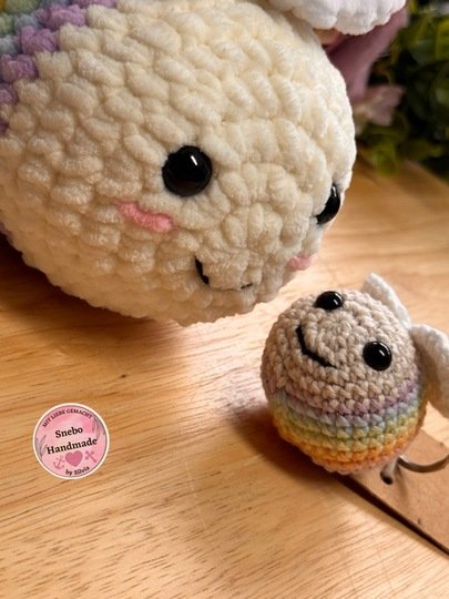 denn alle meine Anleitungen können mit beiden Wollarten ob Chenillegarn oder Baumwollgarn hergestellt werden. Auf dem anderen Bild siehst du, dass du sie mit dieser Anleitung auch in Baumwollgarn angepasst mit einer 2,5 mm Häkelnadel anfertigen kannst. Auch unterschiedliche Farbauswahlen lassen dieses süße Amigurumi im neuen Licht erstrahlen.