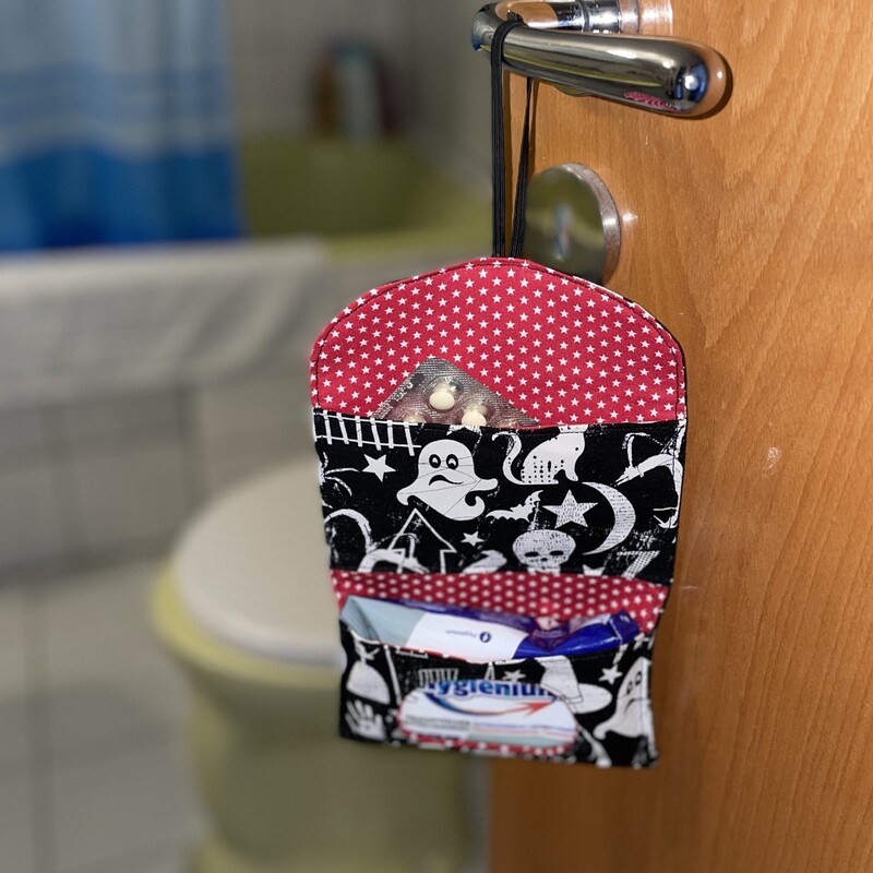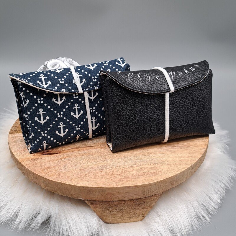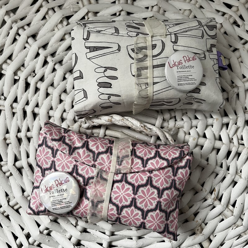 LOKUS POKUS ist ein kleines Täschchen, das als Klobegleiter feuchtes Klopapier und Desinfektionstücher stilvoll verpackt. Mit der Kordel kann es sowohl verschlossen als auch an die Türklinke gehängt werden. Durch die Öffnung kann man die Packung Feuchtpapier öffnen und somit an die Tücher gelangen, während das Täschchen hängt.