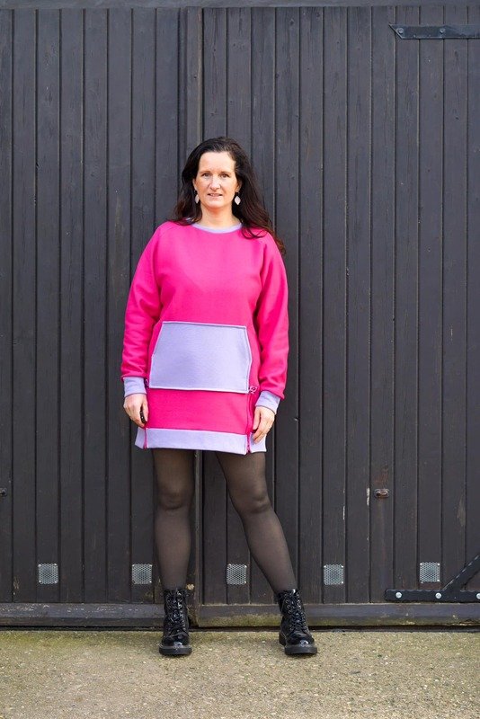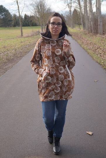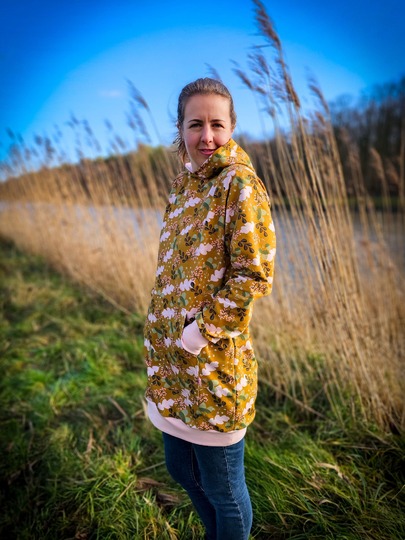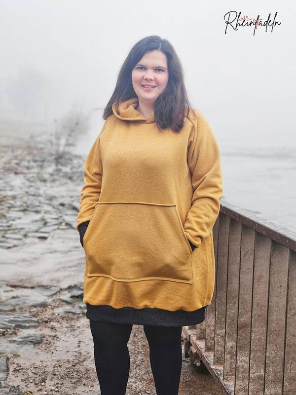Besonders spannend: Das Vorderteil enthält zwei Reißverschlüsse im Saum, die du nach Belieben weglassen kannst – beide Varianten sind in der Anleitung erklärt. Für den perfekten Look kannst du eine von zwei Bauchtaschen aufnähen, Nahttaschen nutzen oder dich für eine Kapuze entscheiden – mit oder ohne Ösen, Tunnelzug und Kordel oder Bündchenstreifen. Die Längenoptionen 1,58 m, 1,68 m und 1,78 m sind enthalten, zudem gibt es eine Sperrlinie für mehr Flexibilität beim Anpassen der Länge.