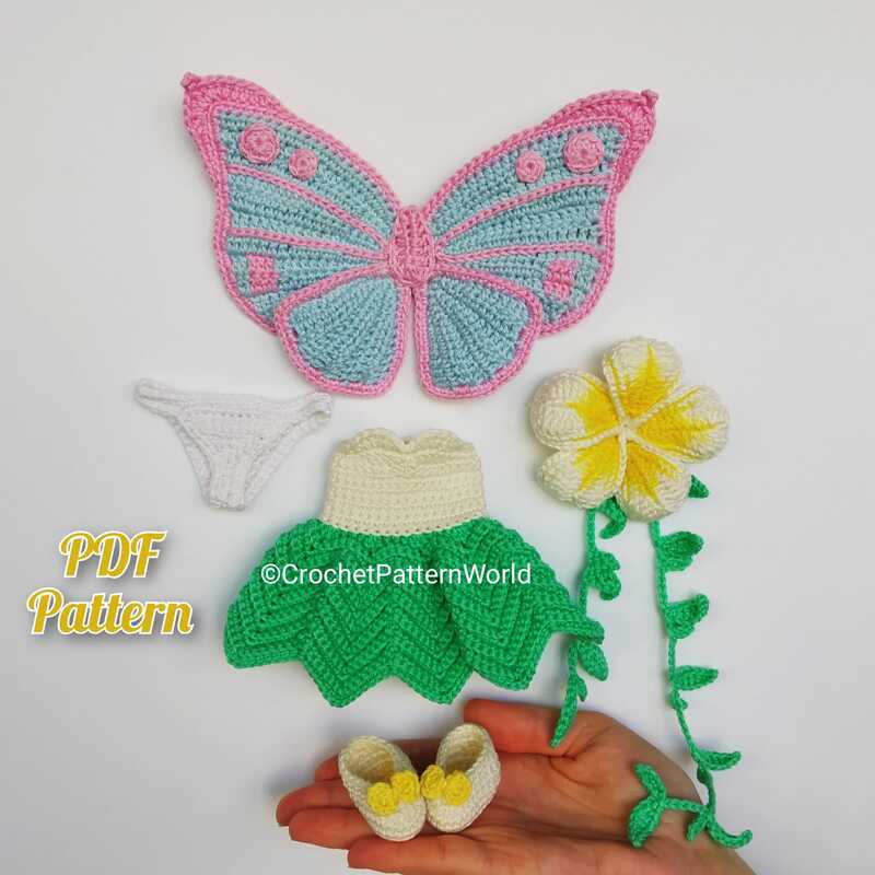 Dieses Häkelmuster enthält eine detaillierte Beschreibung mit vielen Schritt-für-Schritt-Fotos, wie man Kleidung für eine Puppe bastelt: Kleid, Flügel, Kopfschmuck, Schuhe und Höschen.