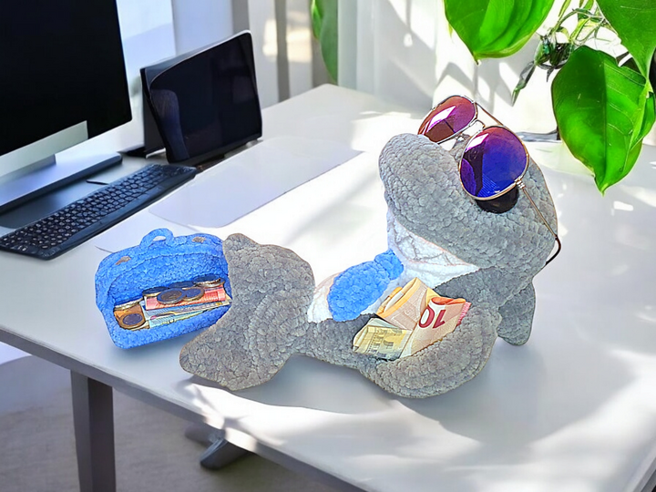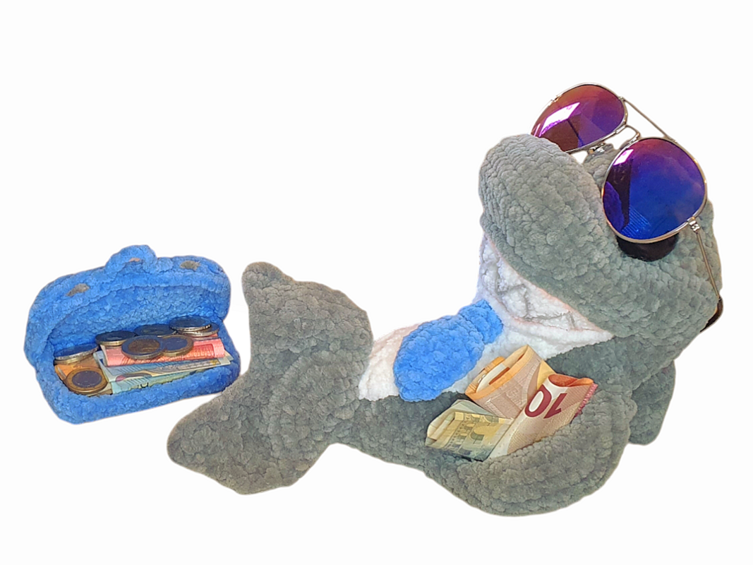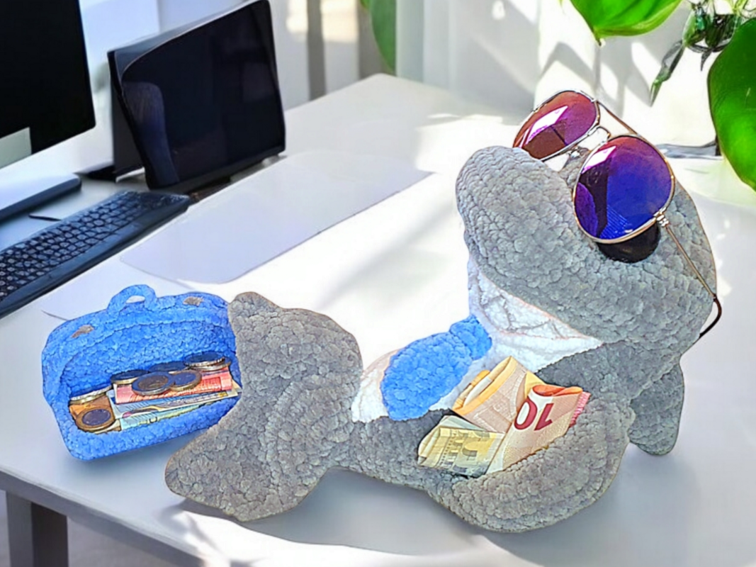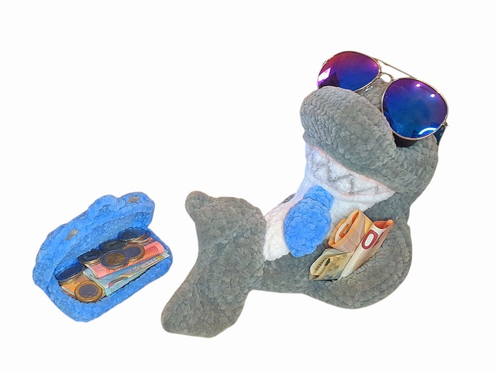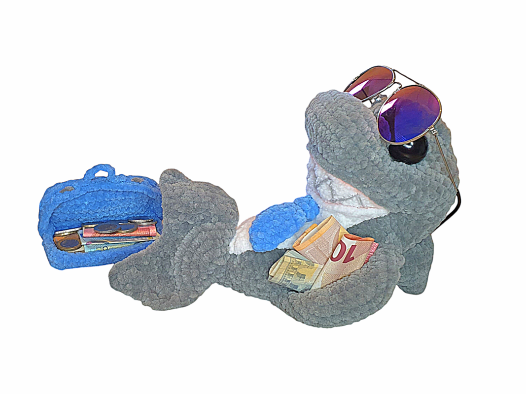 Maney der Finanzhai ist ein lustiges Büro Accessoire und gleichzeitig ein praktischer Brillenhalter. In seinem Koffer finden Büroklammern, USB-Sticks und andere nützliche Kleinigkeiten Platz und sind so immer griffbereit und gut in Szene gesetzt. Falls Many verschenkt werden soll, kannst Du den Koffer z.B. auch mit Geldscheinen oder anderen tollen Sachen befüllen. Die Scheine finden auch unter seiner Flosse reichlich Platz. Andernfalls können hier wichtige Notizen platziert werden.