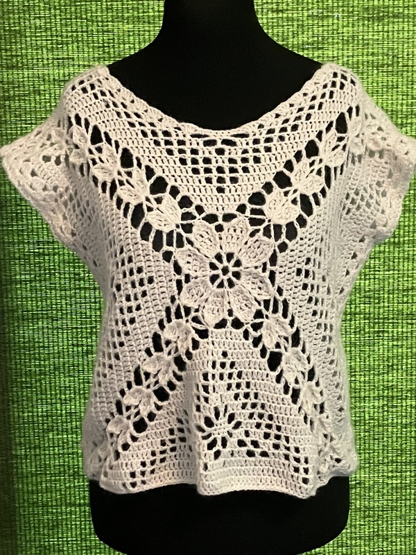 Vor Kurzem habe ich ein Vier-Granny-Top vorgestellt. Jetzt ein Top, welches nur aus 2 Grannys besteht: Eines als Vorderteil und eines als Rückenteil. Vorder- und Rückenteil sind identisch. Man kann es mit oder ohne Ärmel arbeiten. Ich habe es als Kurzversion (bis unter den Gürtel) in dünnerem Garn oder als Langversion (bis unter die Hüfte) mit volumigerem Polyacryl-Garn gehäkelt. Man kann es in Baumwolle häkeln, dann ist es eher was für die warme Jahreszeit, oder in Wolle, dann ist es mit Ärmeln auch ein wintertauglicher Pulli. Das Teil gehört zu meinen „Bauchwegschummlern, da es vorteilhaft ein Bäuchlein kaschiert