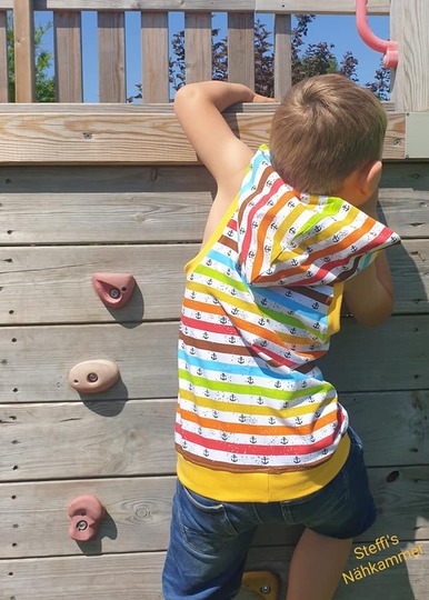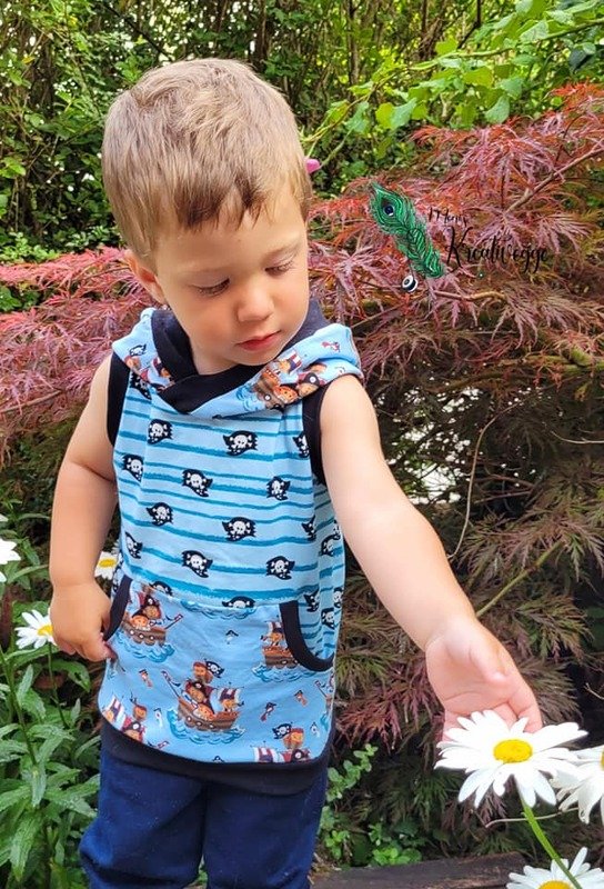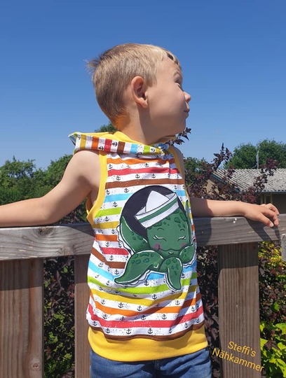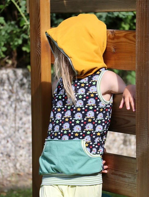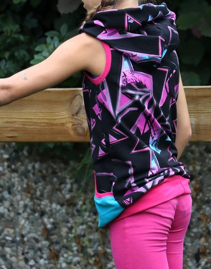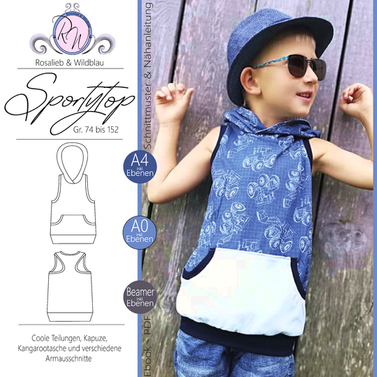 Das Sporty-Top ist ein Schnitt aus meiner Basicserie. Alle Schnitte, die dazugehören, sind dazu gedacht, ein einfaches, unkompliziertes Nähen zu ermöglichen und Stoffe toll wirken zu lassen. Besonderes Augenmerk habe ich darauf gelegt, dass die Schnittmuster, trotz ihrer eher einfachen Form, das gewisse Etwas nicht verlieren. Eben Teilchen, die Spaß machen, sich ultra bequem tragen lassen, für Anfänger geeignet sind und einfach trotzdem viel hermachen :)! Das Sporty-Top ist für jede Jahreszeit geeignet und immer ein absoluter Hingucker. Egal ob Uni- stoff, Musterstoff oder Panel - hier kannst du mit jedem Stoff richtig Gas geben :) Das Sporty-Top hat keine Ärmel und ist zu wärmeren Jahreszeiten ein sportlich anmutendes Top. An kälteren Tagen oder im Winter wird es easy gezwiebelt und kann ganz einfach über ein Langarmshirt gezogen werden! Mit seinen Teilungen ahmt das Sporty- Top einen Lagenlook nach, sodass es so aussieht, als ob ein Trikottop über einem normalen Top getragen wird. Du kannst die Teilung aber tatsächlich neben den beiden anderen Armausschnittvarianten (einfacher Armausschnitt oder Racerback) auch als tiefen und weiten Armausschnitt nutzen, um tatsächlich ein absolut lässiges Top über andere Oberteile zu ziehen! Begleitet werden diese Optionen von einer coolen Kapuze und einer praktischen Kangarootasche.