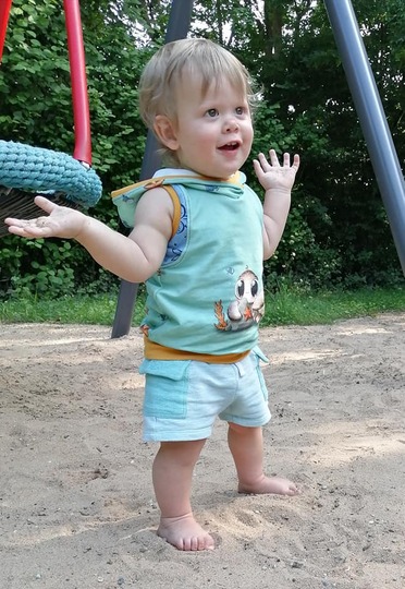 Den Schnitt habe ich in Gr. 74 bis 152 in meinem Echtgrößensystem für dich gradiert. Dabei passt z.B. Größe 74 ab einer Körpergröße von 74cm bis 79cm usw. Das Schnittmuster enthält weder Naht- noch Saumzugabe und ist auf dünnere, dehnbare Stoffe wie Jersey oder weichen French Terry ausgelegt.
