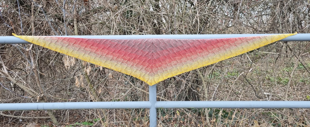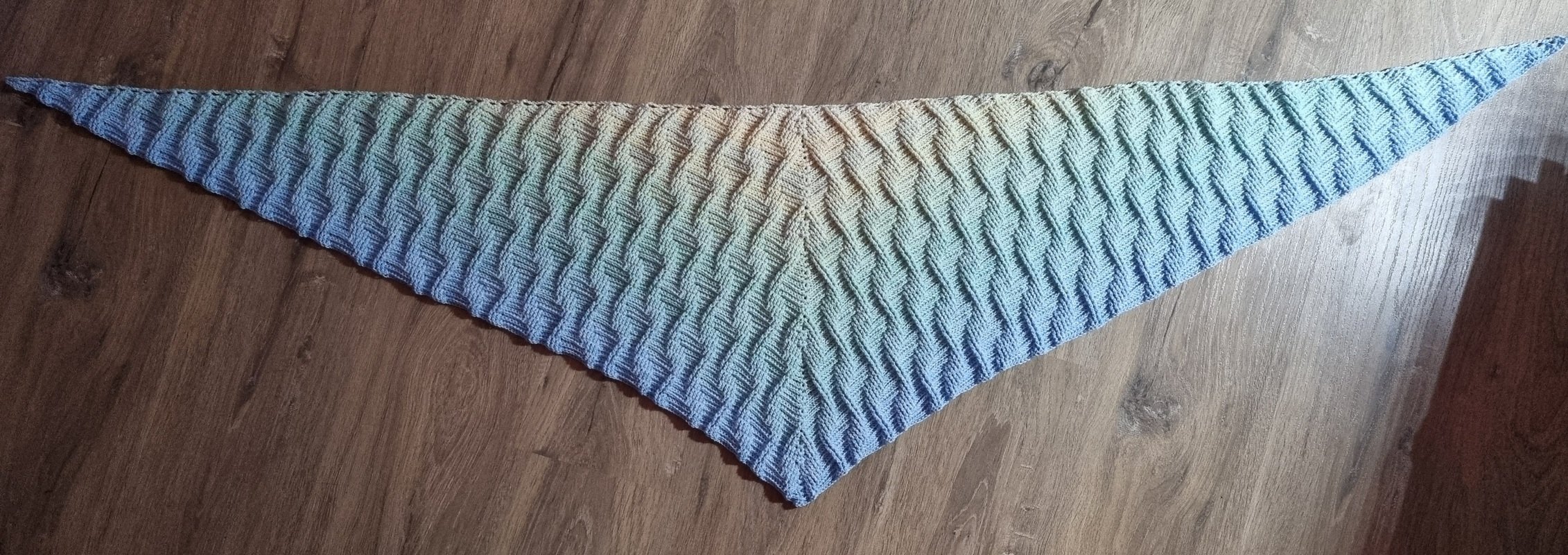 Es ist ein flaches, symmetrisches Tuch, das beliebig groß gehäkelt werden kann. Es besteht fast vollständig aus vorderen und hinteren Reliefstäbchen, wodurch eine beeindruckende Struktur entsteht.