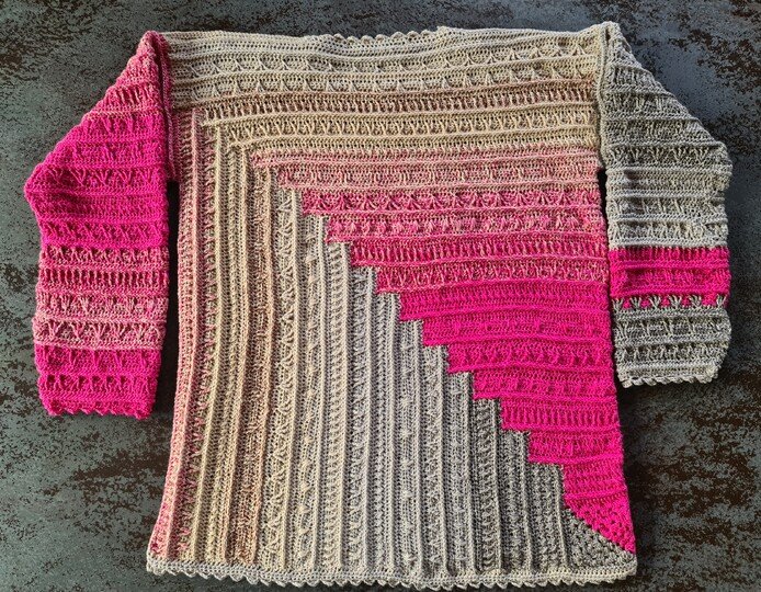 Modell Pink: 4 gleiche Farbverlaufbobbel, die gegengleich verhäkelt wurden (4 x 625 m "Rote Beete" von Bobbel-Solo) für Gr. 40/42.