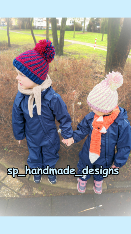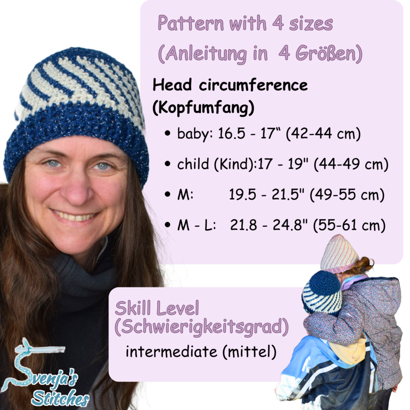 Die Anleitung ist gut für Anfänger im mehrfarbigen Häkeln geeignet . So kann man dann schon mal lernen, mit zwei Farben und zwei Knäulen gleichzeitig zu hantieren. Und hinterher hat man für die ganze Familie eine Mütze mit WOW- Effekt und das garantiert stressfrei .