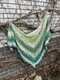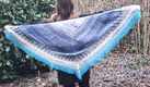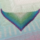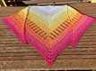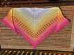 Mein Beispieltuch, gehäkelt mit einem Farbverlaufsbobbel 3-fädig/1.000m Lauflänge und NS 3,5, hat eine Spannweite von 1,98m und eine Tiefe von 0,80m erreicht.