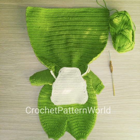 Diese Häkelanleitung enthält eine detaillierte Beschreibung, wie man Kleidung für die Lulu-Puppe im Waldelfen-Overall, Flasche und Stiefeletten kreiert, sowie viele Schritt-für-Schritt-Fotos.