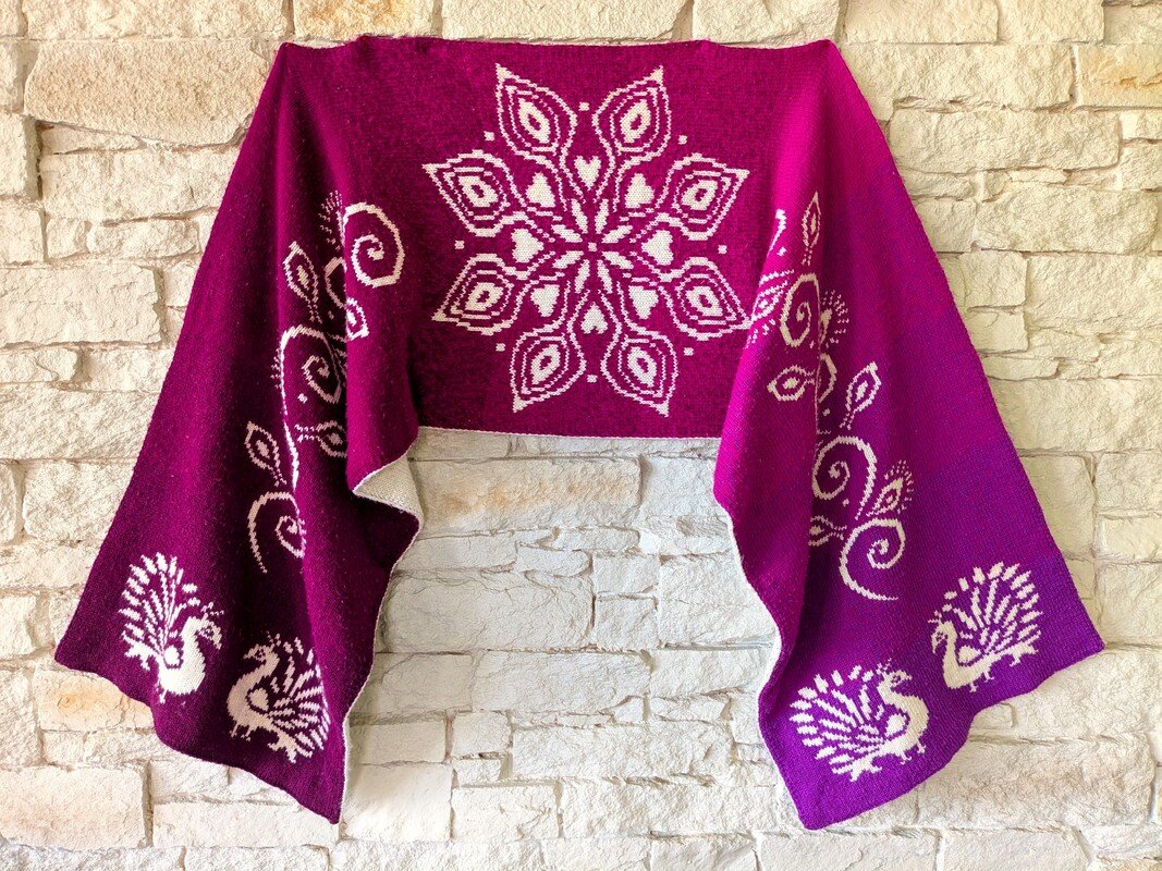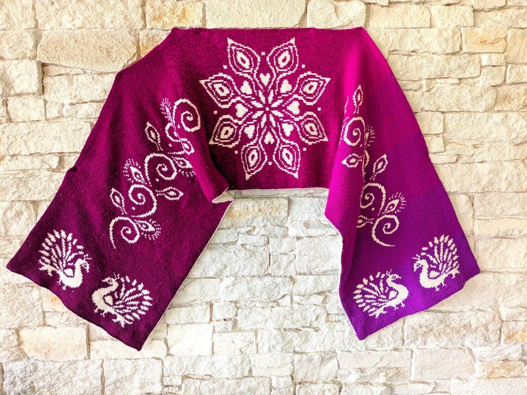 Der weiße Pfau steht symbolisch für Reinheit, aber auch für Liebe, Schönheit, Leidenschaft und Reichtum – er passt damit nicht nur wunderbar zu einer Hochzeit, sondern eigentlich zu allen schönen Gelegenheiten im Leben Deshalb bekommt er auf dieser Stola die Hauptrolle. Das Mandala im Zentrum der Stola sowie die Verzierung greifen das Pfauenthema auf, so dass ein stimmiges und wunderschönes Gesamtbild entsteht.