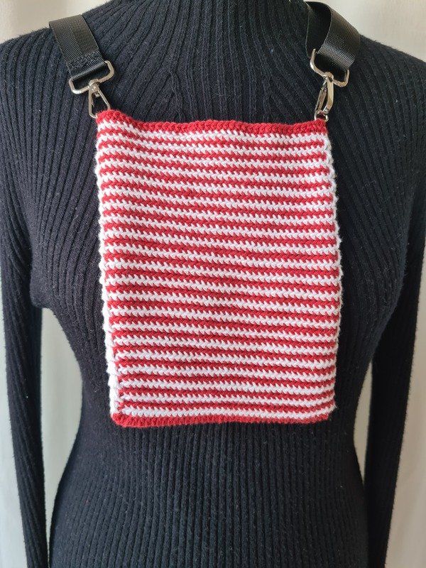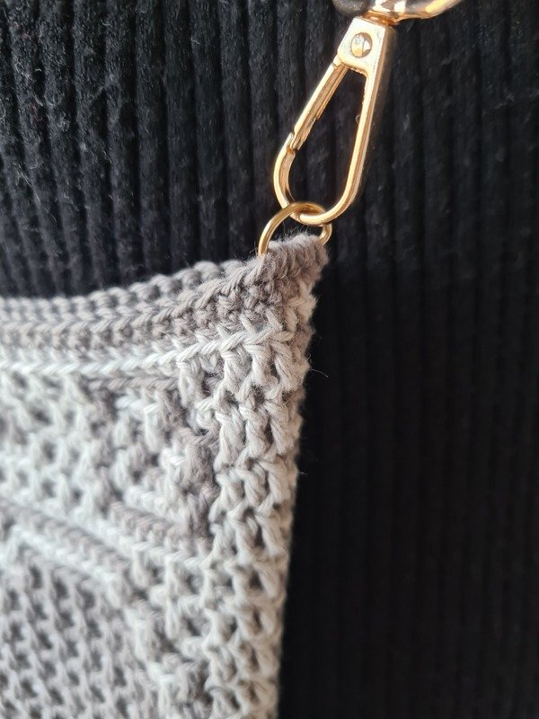 Es ist keine Anleitung für einen gehäkelten Gurt enthalten. Man kann einen gekauften Gurt anbringen oder sich selbst einen häkeln.
