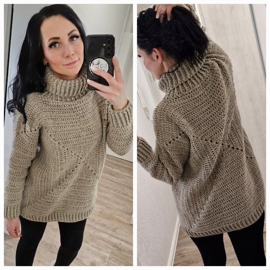 Dieser Pullover besteht überwiegend aus Stäbchen und geht daher auch super schnell von der Hand. Er eignet sich perfekt für den Winter und hält dich an kühlen Tagen warm. Der Pullover setzt sich aus 2 großen Quadraten zusammen. Die Ärmel und der Rollkragen werden direkt an die Quadrate gehäkelt. Der Kragen kann bei Belieben auch einfach weggelassen werden.