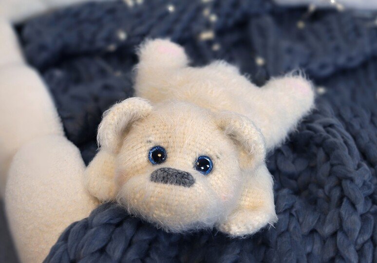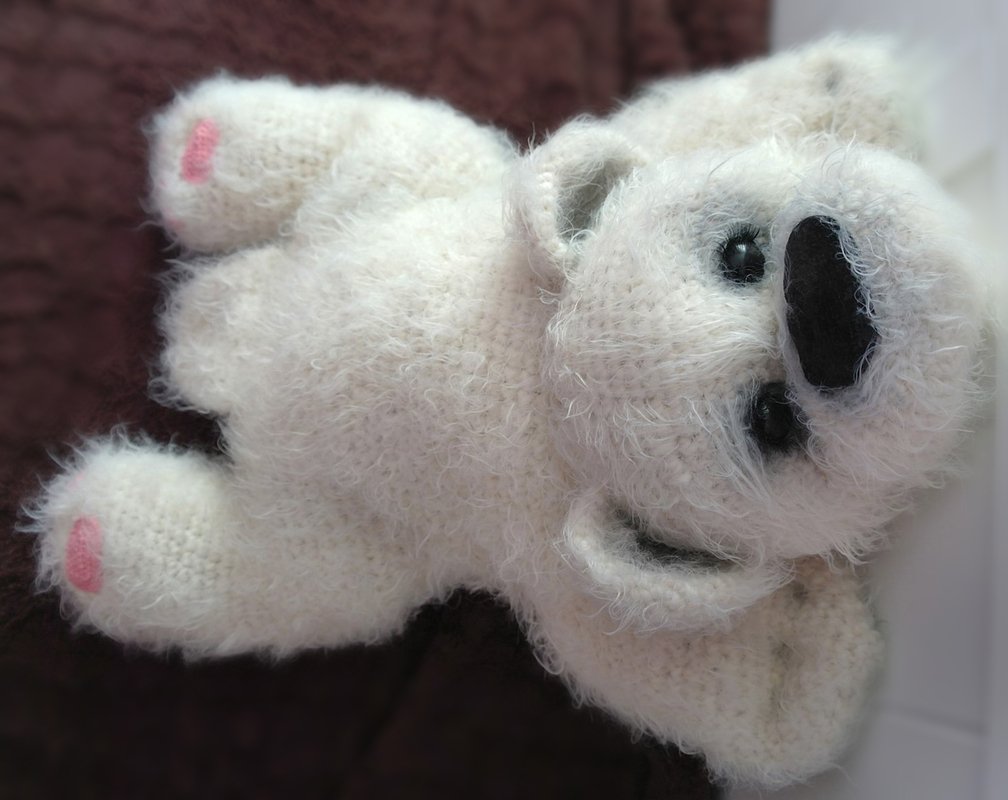 ist aus einer dickeren Wolle gehäkelt. Die Wolle ist leider unbekannt. Wer einen großen Bären