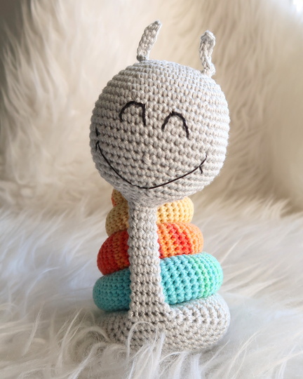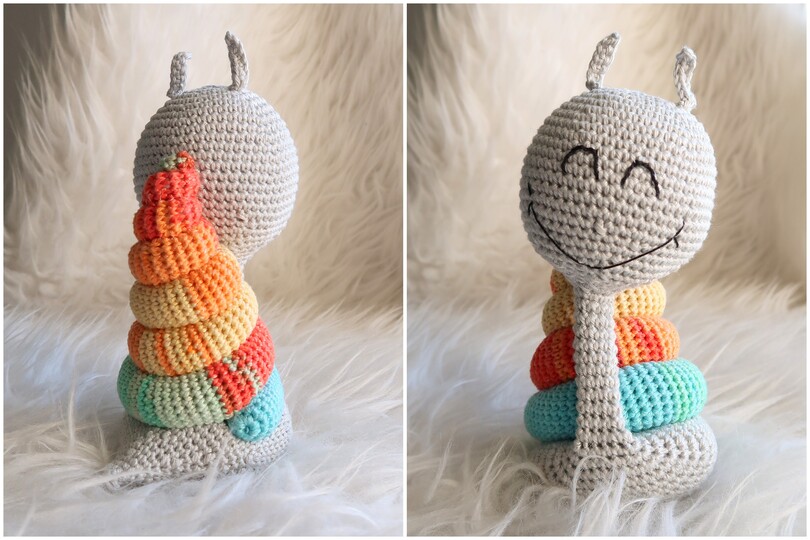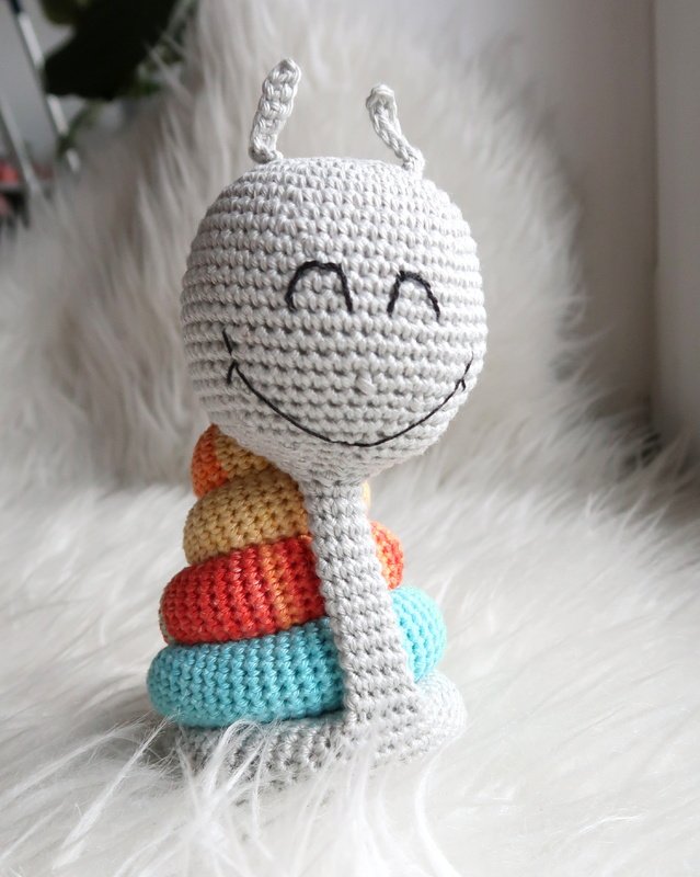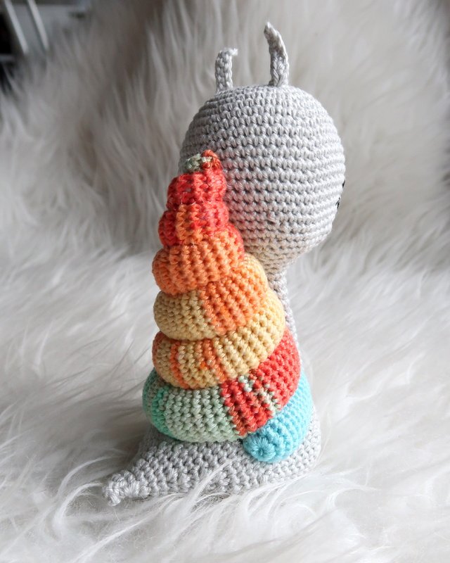 Wenn du mit Baumwolle (125m LL auf 50g) häkelst, wird deine Grinseschnecke ca. 16cm hoch.