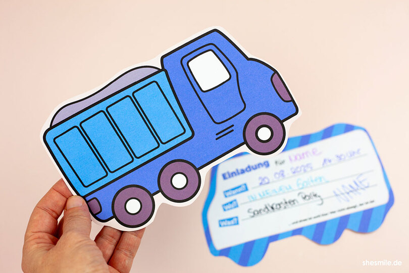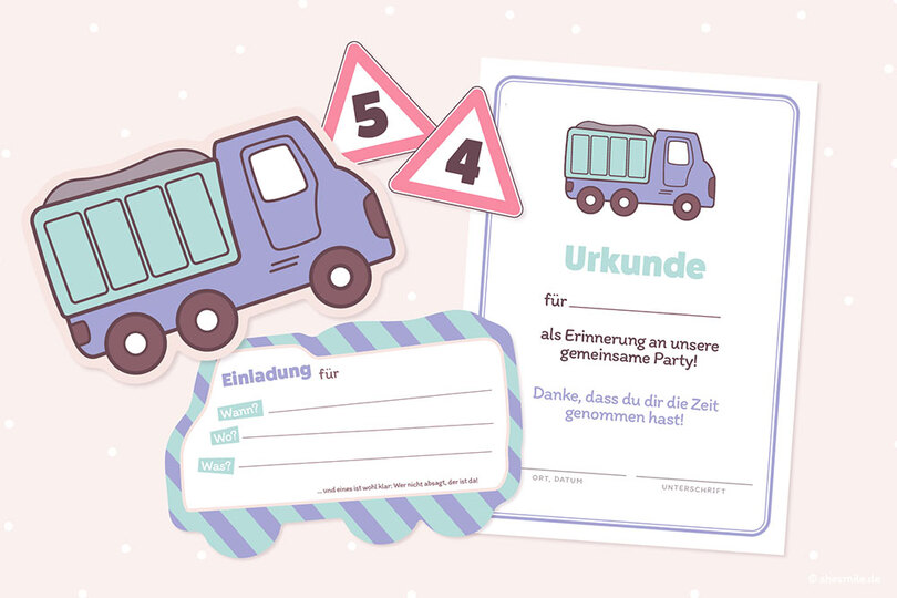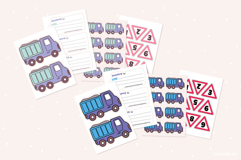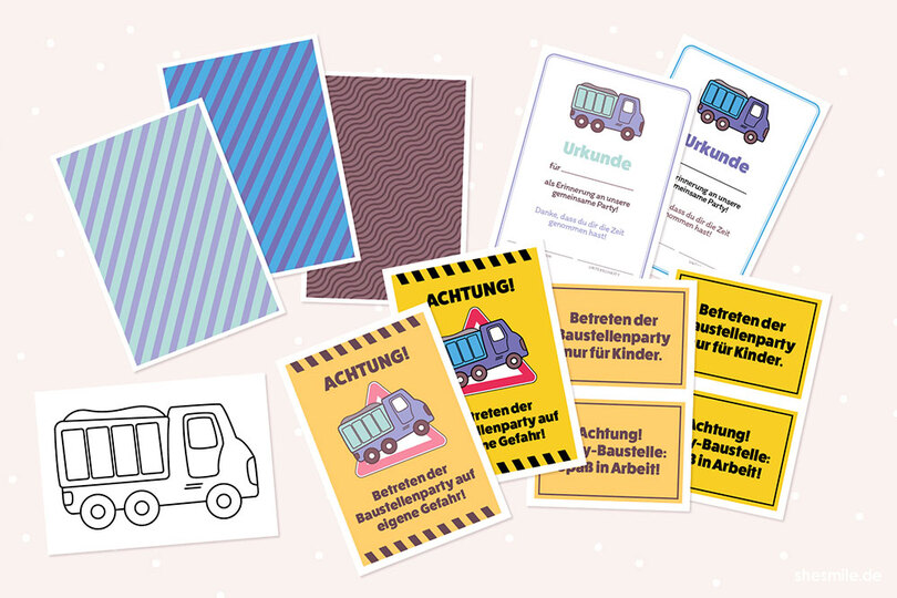Weitere Muster-Vorlagen und ein Ausmalbild des Kipplasters helfen dir beim Gestalten deiner individuellen Party-Ideen.