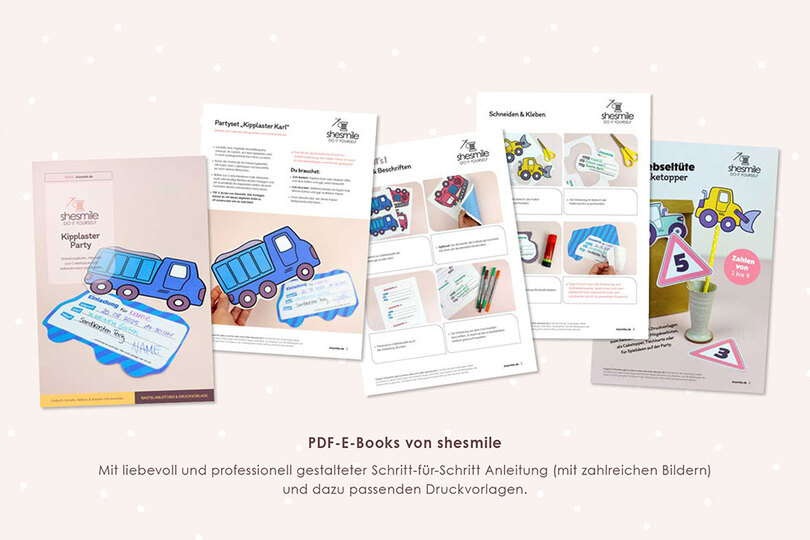 PDF-E-Books von shesmile: Alle Vorlagen kannst du mit dieser digitalen Datei so oft ausdrucken wie du möchtest. Die leicht verständliche Schritt-für-Schritt-Anleitung mit vielen Fotos ist auch für Bastelanfänger und Kinder geeignet.