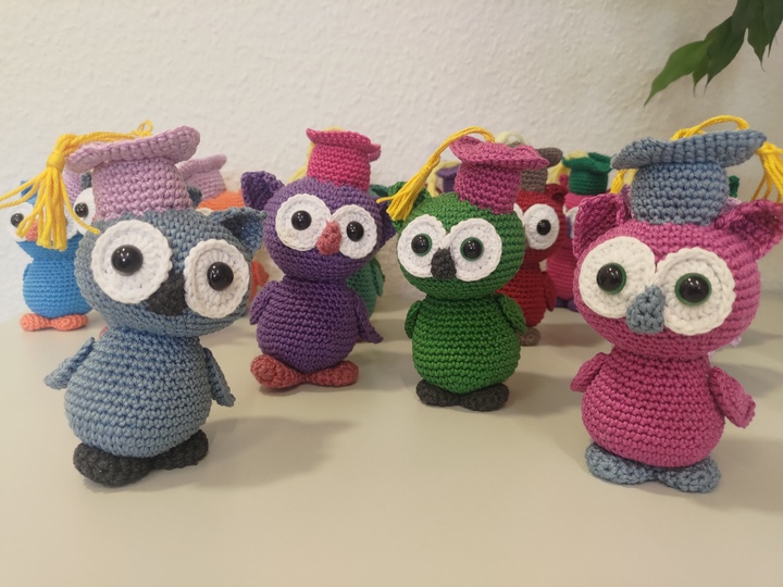 Die Anleitung umfasst die Eule sowie den Doktorhut und die Weihnachtsmütze.