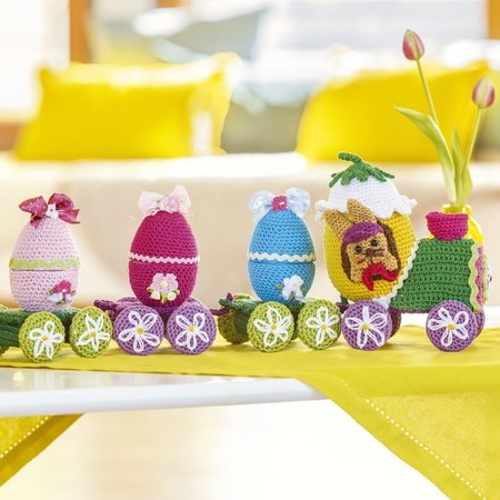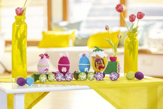 blumigen Deko-Elementen und dem Osterhasen als Lokführer auch
