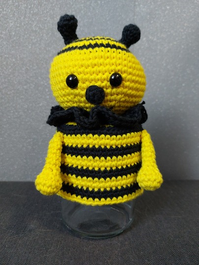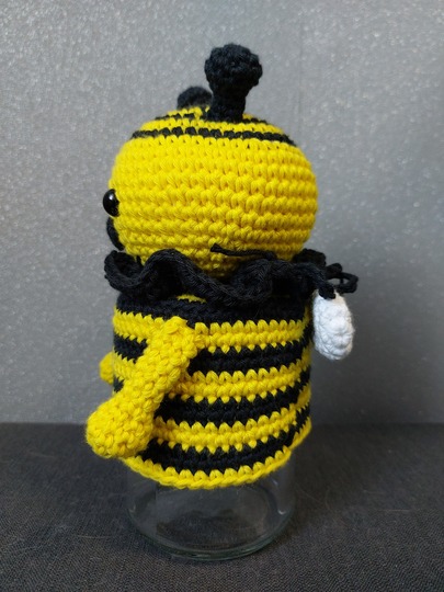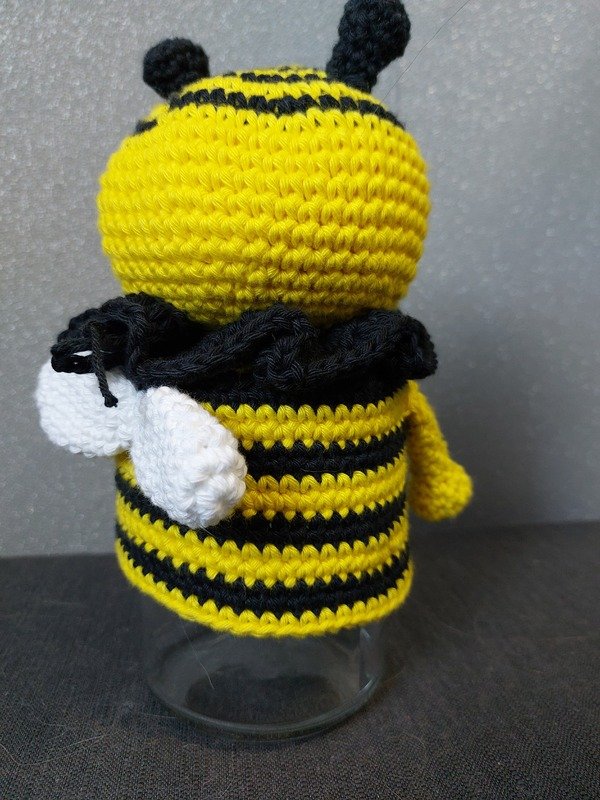 Die fertige Honigbiene wird je nach Wollart und Nadelgröße unterschiedlich groß. In meiner Anleitung mit Nadelstärke 2-2,5 und der entsprechenden Wollart wird die fertige Honigbiene ca. 10 cm hoch. Die 10 cm sind der Kopf, das Glas kommt auf die Höhe extra noch dazu.