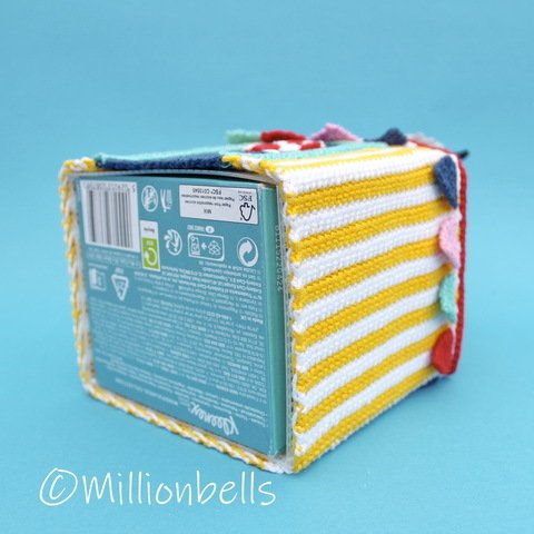 Es gibt 2 Öffnungen: 1 unten, um eine Taschentuchbox einzustecken, und 1 oben, um die Taschentücher herauszuziehen. Teile in dieser Anleitung werden in Reihen sowie in Spiralrunden gearbeitet. Die Dekorationen werden als Einzelstücke angefertigt.