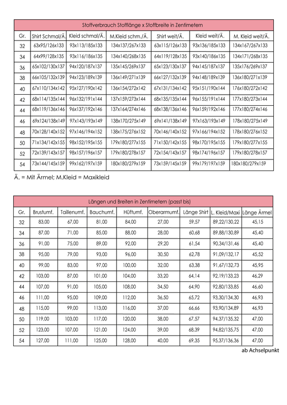 Das Schnittmuster ist in Gr. 32 bis 54 gradiert und auf eine Körpergröße von ca. 1,64cm ausgelegt.
