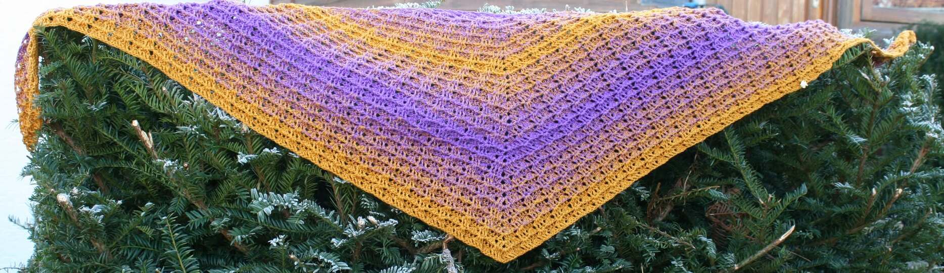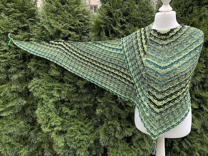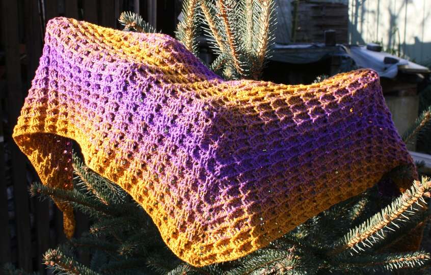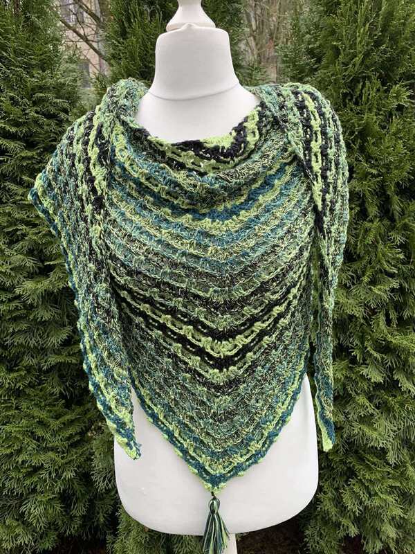 Das Tuch heißt Glückstrio Tuch, weil es mit den Glückstrio Bobbel von Glücksgarne gehäkelt wurde.